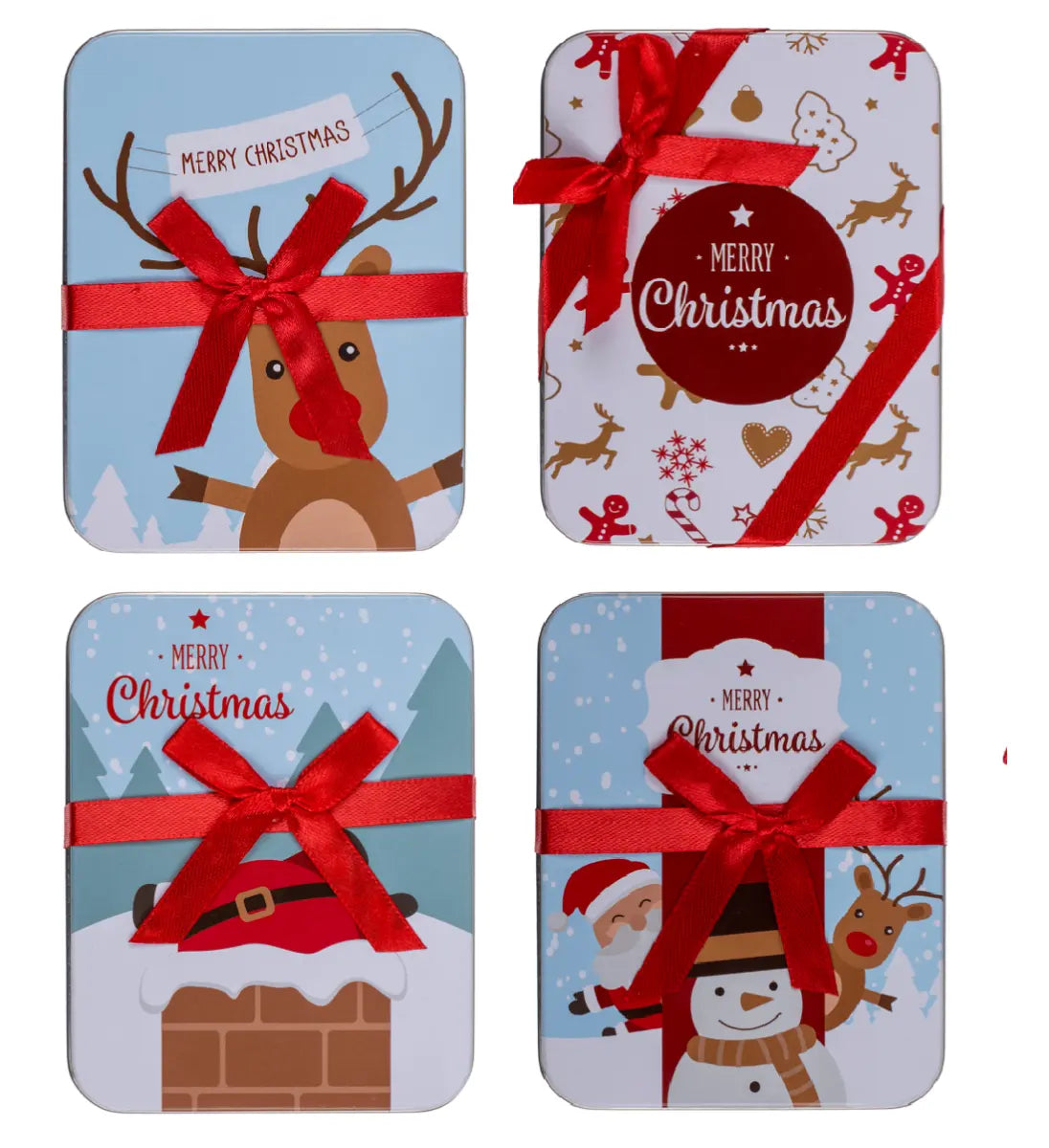 Verpacke deine Weihnachtsüberraschungen stilvoll mit der Geschenkbox aus Metall „Frohe Weihnachten“. Diese hochwertigen Metallboxen vereinen Funktionalität und festliches Design, um kleine Geschenke, Süssigkeiten oder Schmuck liebevoll zu präsentieren. Mit vier unterschiedlichen Motiven, darunter süsse Schneemänner, Rentiere und weitere weihnachtliche Designs, ist jede Box ein Highlight unter dem Weihnachtsbaum. Bitte beachte, dass das Design zufällig ausgewählt und versendet wird – so bleibt jede Bestellung spannend!