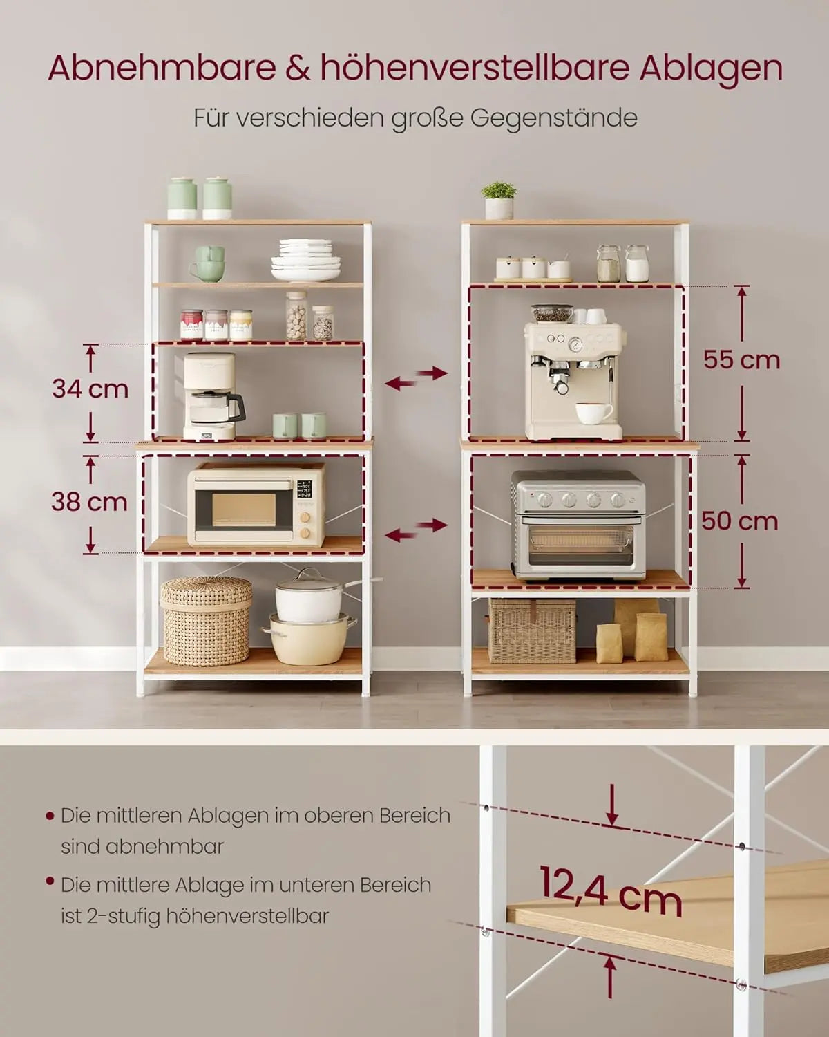 Die mittlere Ablage im unteren Bereich ist höhenverstellbar und passt sich Ihren Bedürfnissen an. Egal, ob Sie einen Mixer, eine Heissluftfritteuse oder grosse Töpfe unterbringen möchten, dieses Regal bietet die Flexibilität, die Sie benötigen.