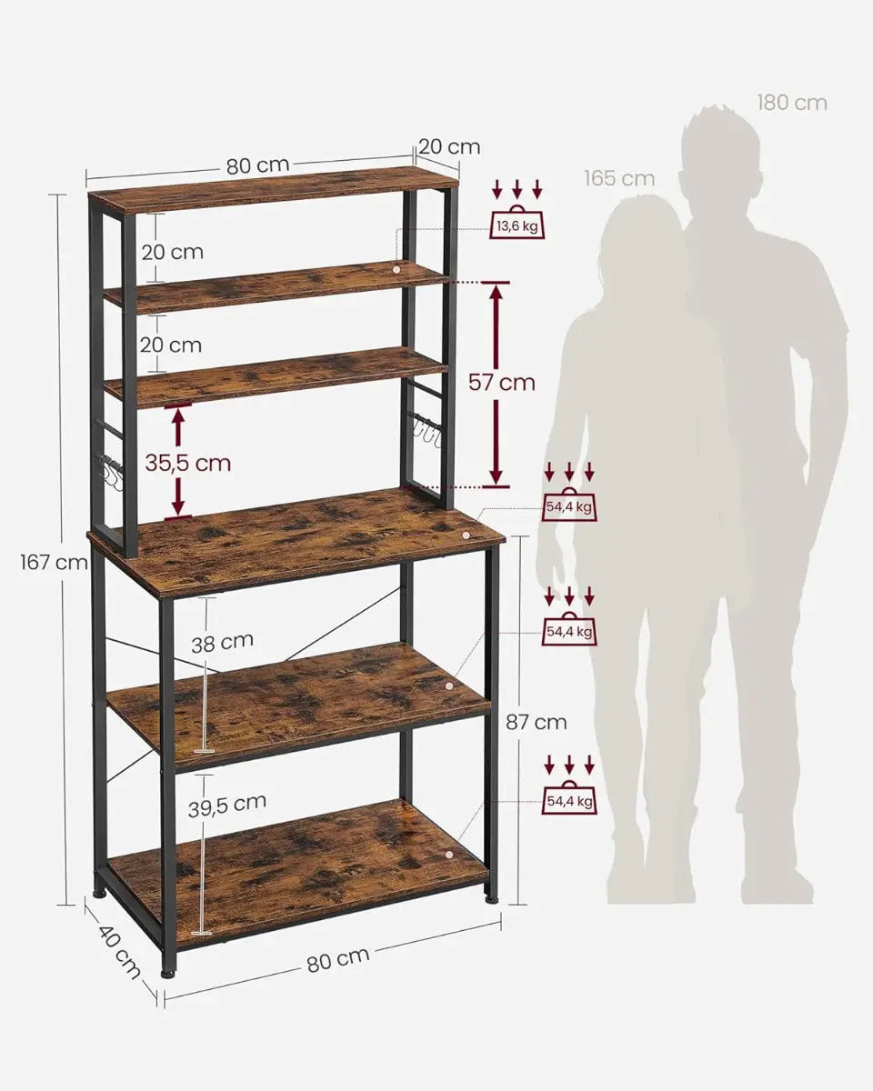 Die solide Konstruktion aus robustem Stahlrahmen und langlebigen Spanplatten sorgt dafür, dass das Regal stabil und belastbar ist. Mit den kompakten Massen von 40 x 80 x 167 cm ist es ideal für kleine Küchen und nutzt den verfügbaren Platz optimal aus.