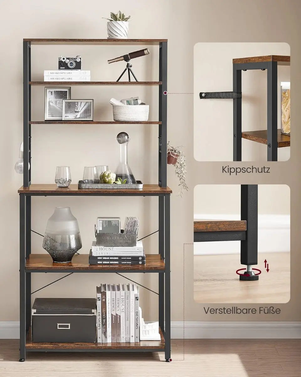 Kunden begeistern vor allem das stimmige Industrie-Design und die platzsparende Vielseitigkeit des SONGMICS Küchenregals. Gelobt werden die 6 Ablagen und 6 Haken, die höhenverstellbare mittlere Ebene, die robuste Stahlkonstruktion, verstellbare Füße sowie der Kippschutz – ideal für kleine Küchen und schwere Geräte.
