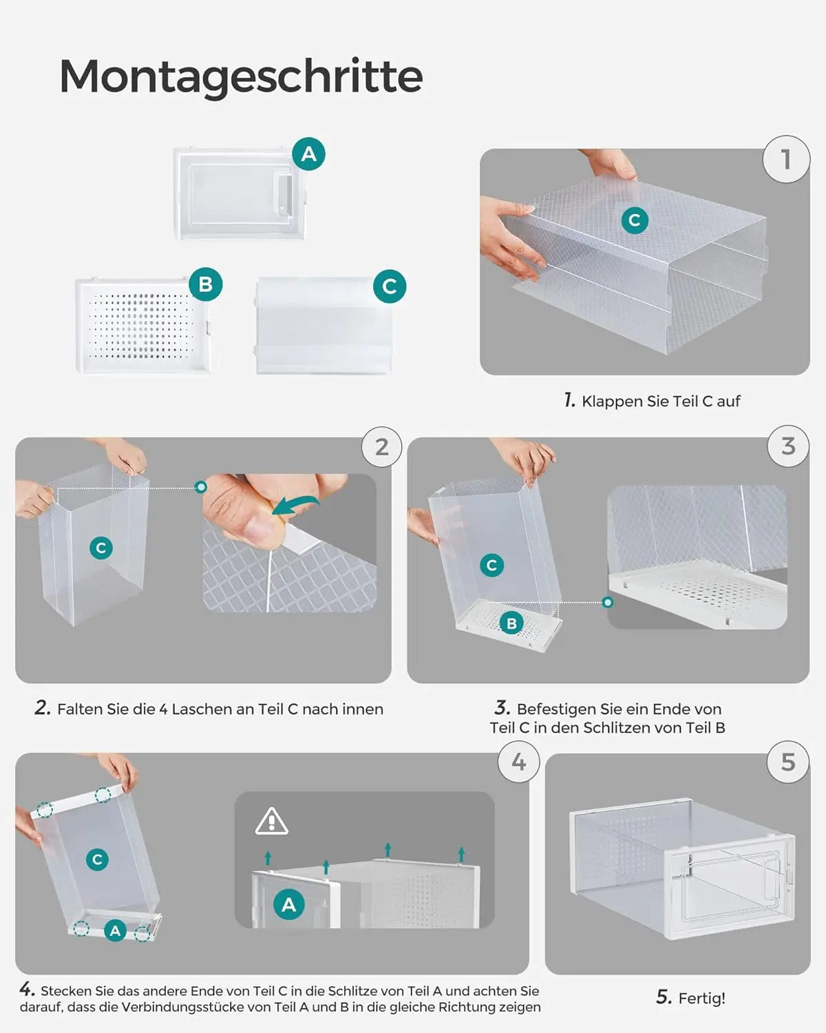 Transparente Boxen für schnellen Blick auf jedes Paar, stapelbar durch clevere Bodenrillen, belüftete Fronttür, Platz bis Grösse 46