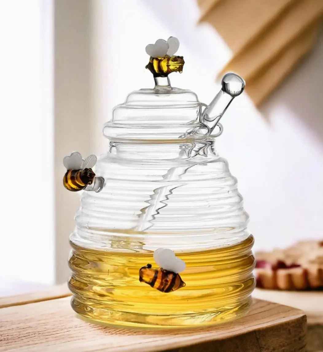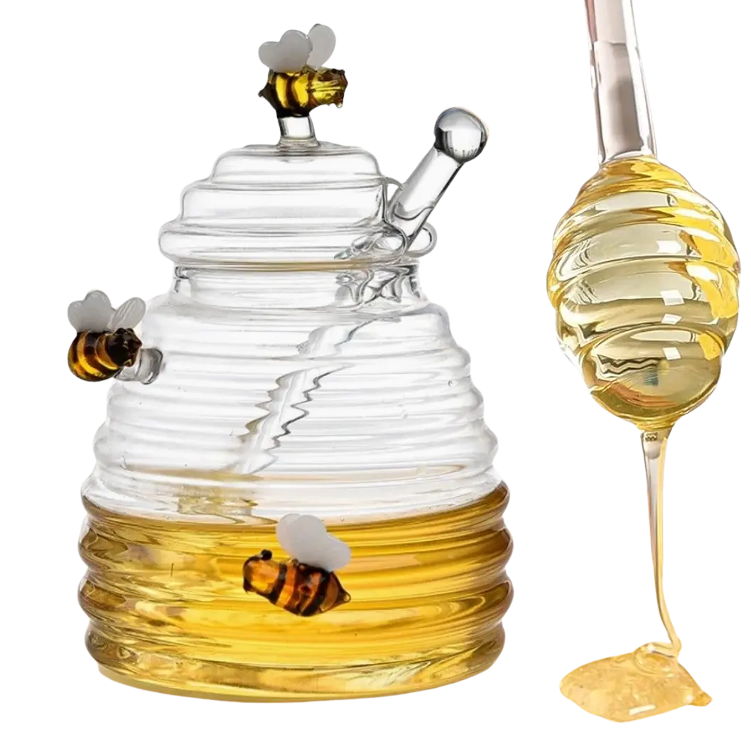 Edles Honigglas mit Deckel und Honigstab und Bienendekoration