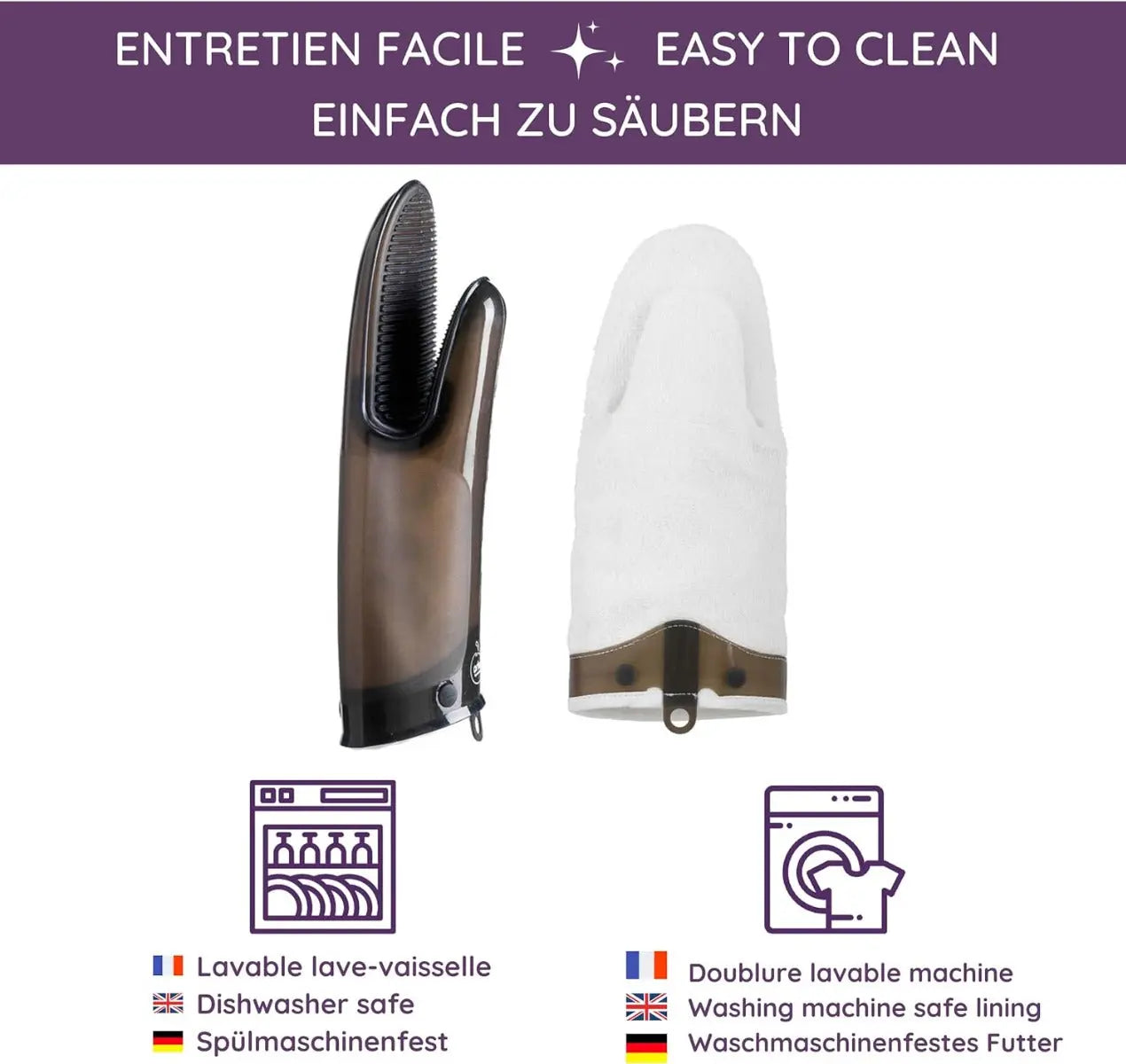 Ein besonderes Merkmal dieses Ofenhandschuhs ist seine hohe Pflegeleichtigkeit. Das herausnehmbare Baumwollfutter ist maschinenwaschbar, während der Silikon-Außenteil spülmaschinenfest ist. Das Silikonmaterial ist sehr hitzebeständig, was bedeutet, dass der Handschuh sich nicht verfärbt und somit lange seine ansprechende Optik behält.