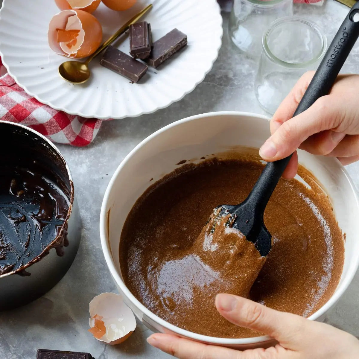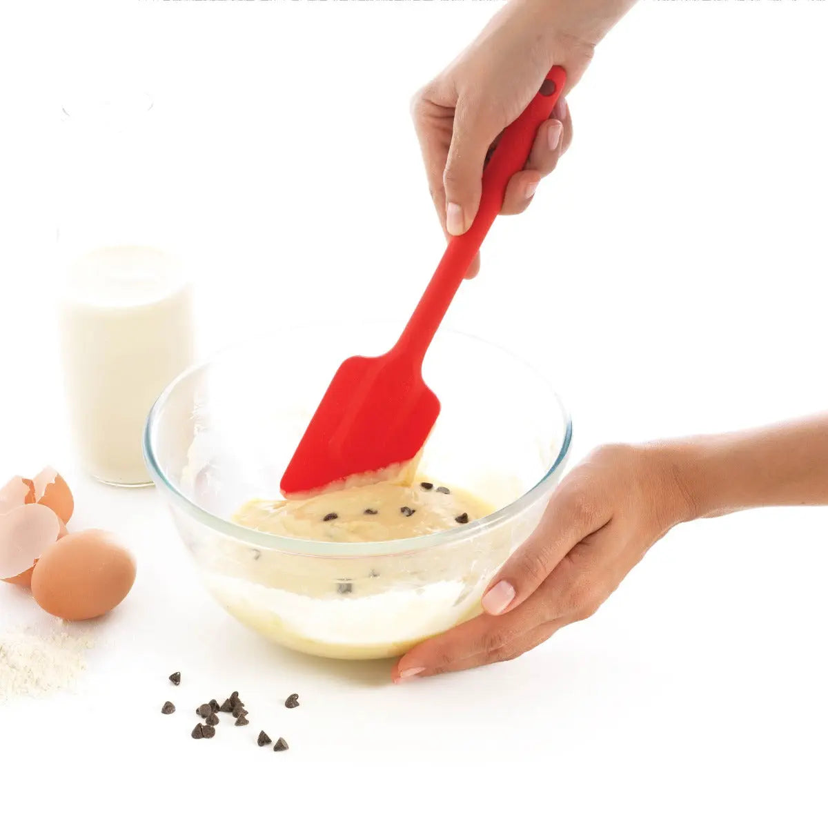 Der Vollsilikon-Spatel ist ideal, um Gefäße kratzfrei abzuschaben und Kuchen zu überziehen.