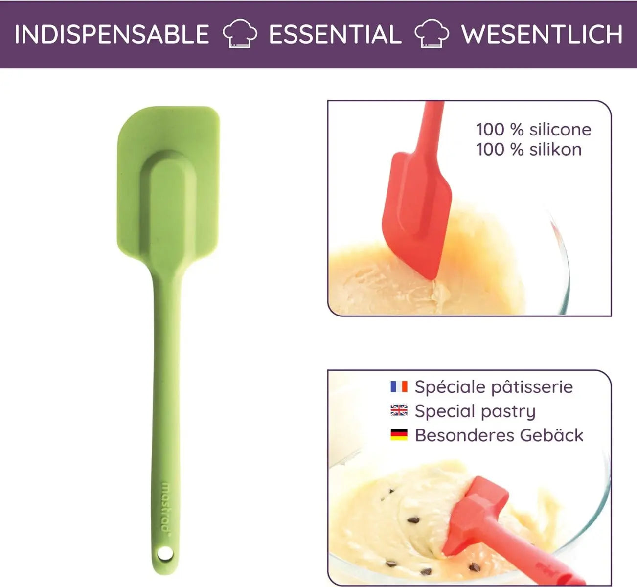 Der "Spachtel Silikon Grün" von Mastrad ist ein vielseitiges und unverzichtbares Küchenwerkzeug, das speziell für das Mischen und Beschichten von Desserts sowie das Auskratzen von Behältern konzipiert wurde. Dieser Spachtel ist aus lebensmittelechtem Silikon gefertigt und beständig gegen sehr hohe Temperaturen bis zu +300 °C, was ihn sowohl für kalte als auch für warme Rezepte ideal macht. Mit seiner Monoblock-Struktur und dem flexiblen Kopf ist der Spachtel das ideale Utensil für erfolgreiche Rezepte. Er liegt gut in der Hand und bietet durch das Silikonmaterial einen Kratzschutz für Ihre Kochutensilien. Der Spachtel ist einfach waschbar, sei es in der Waschmaschine oder von Hand, und zeichnet sich durch seine Langlebigkeit und Robustheit als Küchenhelfer aus. Die Marke Mastrad steht seit 25 Jahren für qualitative Küchengeräte in kreativem Design. Ihre Mission ist es, den Küchenalltag durch innovative Produkte zu erleichtern. Der "Spachtel Silikon Grün" ist ein weiteres Beispiel für Mastrads Engagement, praktische und ästhetisch ansprechende Lösungen für die Küche anzubieten.