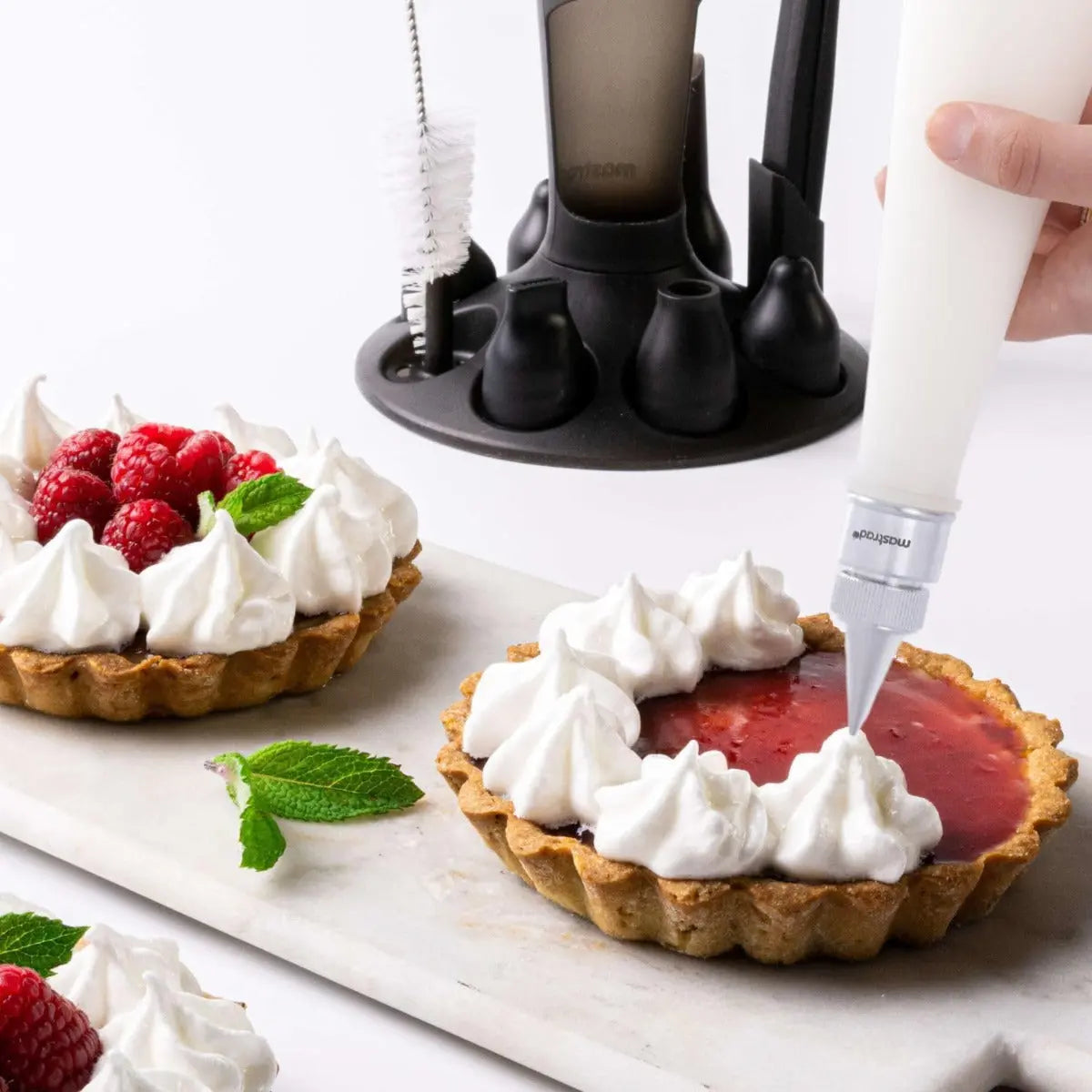 Der 1-Liter-Spritzbeutel aus flexiblem Silikon ist innen glatt, wodurch Teige und Cremes gleichmässig fliessen und sich mühelos verarbeiten lassen. Ein cleverer vertikaler Ständer erleichtert das Befüllen, hält alles sauber und dient gleichzeitig als praktischer Aufbewahrungsort für die Tüllen, die Klammer und die Reinigungsbürste.