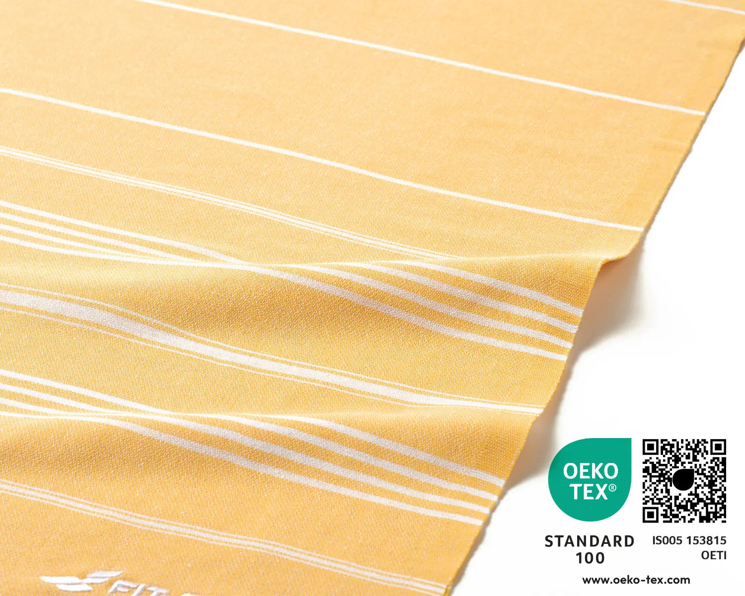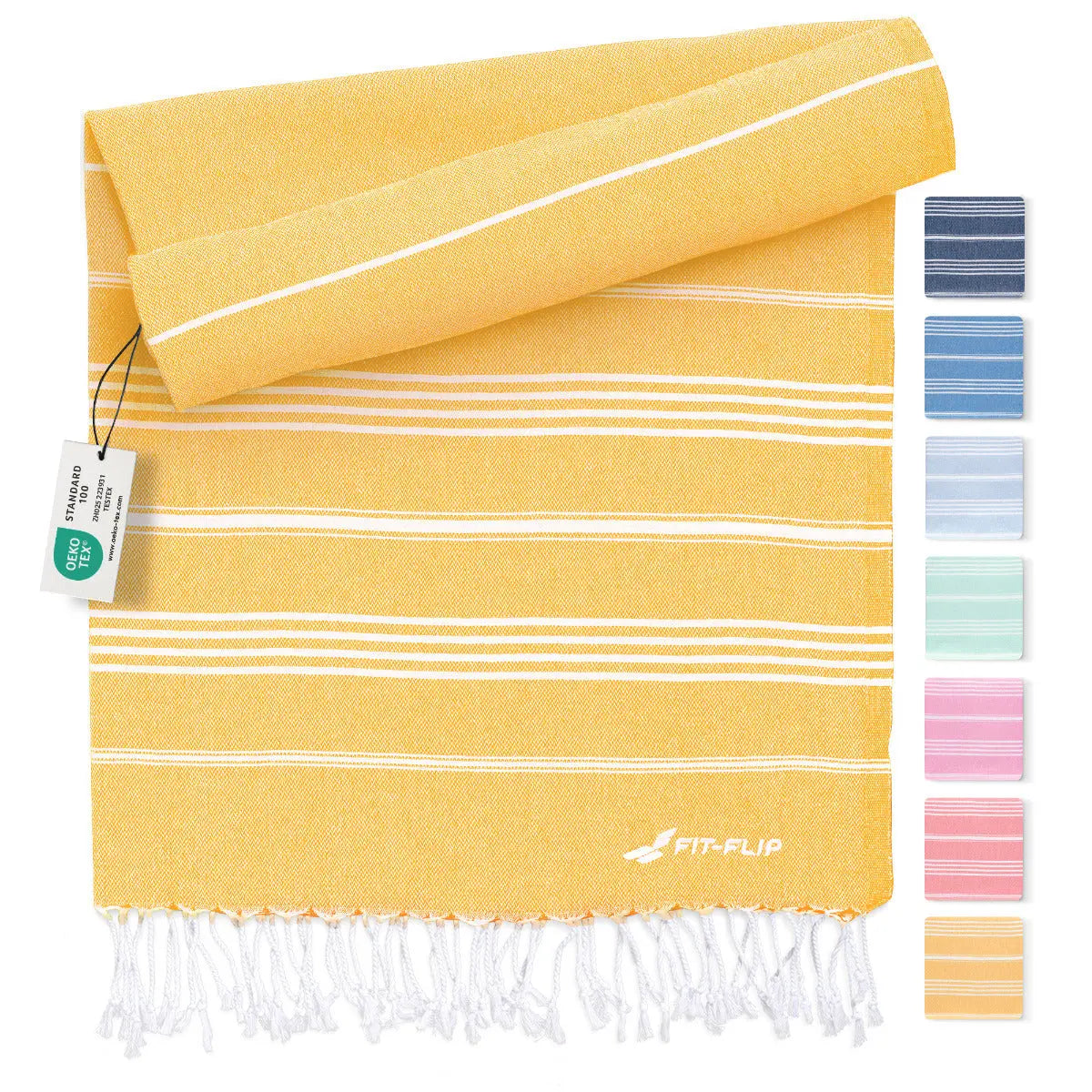 Das Fit-Flip Hamamtuch besticht durch sein elegantes Design und die hochwertige Verarbeitung aus 100% recycelter Baumwolle. Die feine Webstruktur und die dekorativen Fransen verleihen dem Tuch einen zeitlosen Look, der sowohl am Strand als auch in der Sauna oder beim Yoga eine gute Figur macht.