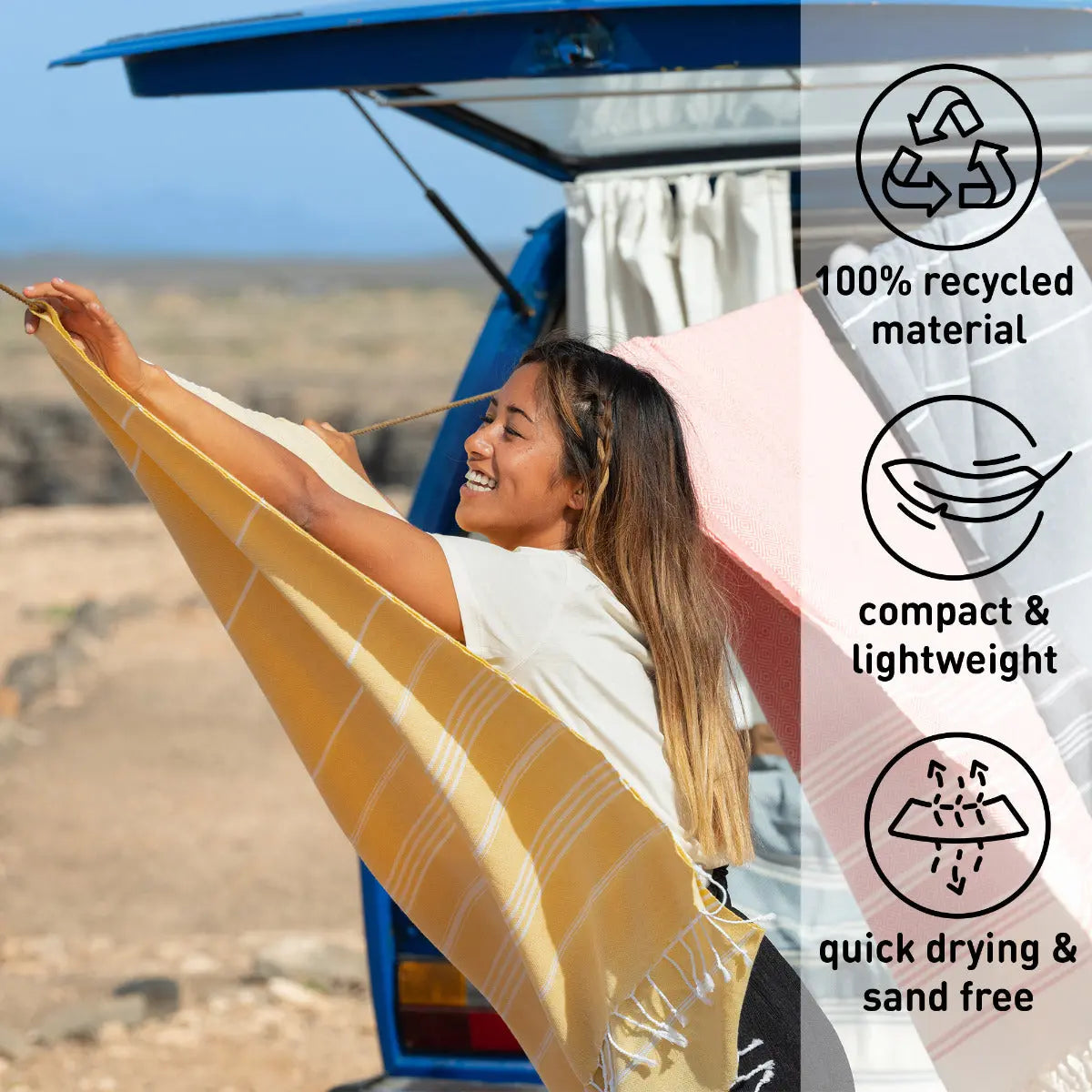 Elegantes Design aus 100% recycelter Baumwolle, Hohe Saugfähigkeit und schnelle Trocknungszeit, Ideal für Strand, Sauna und Yoga