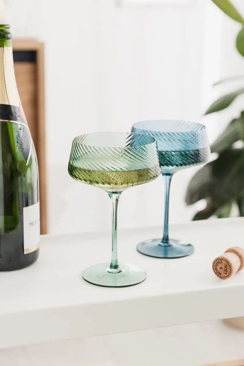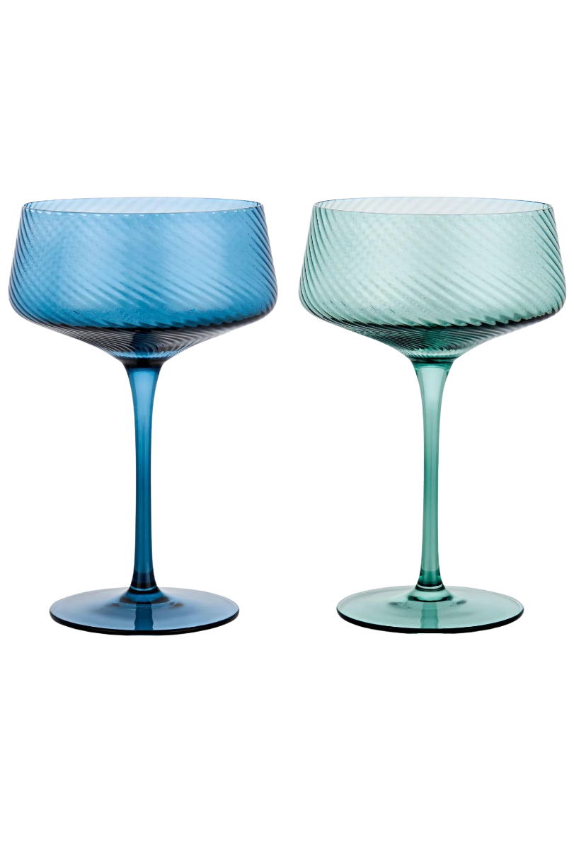 Die Champagnerschalen Twist in Grün und Blau setzen farbliche Akzente auf jedem Tisch – frisch, modern und mit einem Hauch Retro. Jedes Glas wurde handgefertigt und erhält durch die gedrehte Glasstruktur seinen ganz eigenen Charakter. Die harmonische Verbindung aus kühlem Blau und lebendigem Grün macht dieses Set zum idealen Begleiter für stilvolle Aperitifs und besondere Momente.