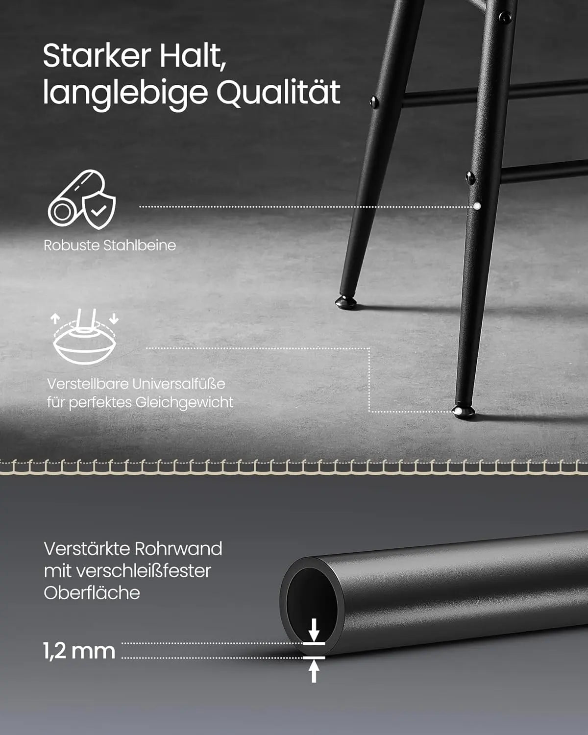 Kunden schätzen das moderne Design und den unvergleichlichen Komfort der SONGMICS EKHO Barhocker. Besonders beliebt sind das reich texturierte Kunstleder und die feinen Nähte, die Eleganz ausstrahlen. Der 8 cm dicke Formschaum sorgt für ein angenehmes Sitzerlebnis, während die verstellbaren Fußstützen für jeden Gast optimalen Komfort bieten. Zudem überzeugen die stabilen Metallbeine und der pflegeleichte Bezug, der eine einfache Reinigung ermöglicht. Diese Hocker sind die perfekte Kombination aus Stil und Funktionalität.