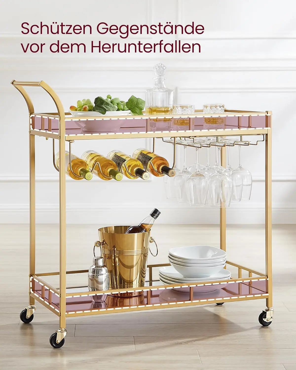 Kunden sind begeistert von dem eleganten goldfarbenen Gestell und den verspiegelten Glasablagen, die jedem Raum Luxus verleihen. Besonders geschätzt werden die großzügige Ablagefläche, die 2 Gläser- und 4 Flaschenhalter für sicheren Halt, die vier Rollen (zwei mit Bremse) für flexible Mobilität sowie die kinderleichte Montage und der praktische, geschwungene Griff.
