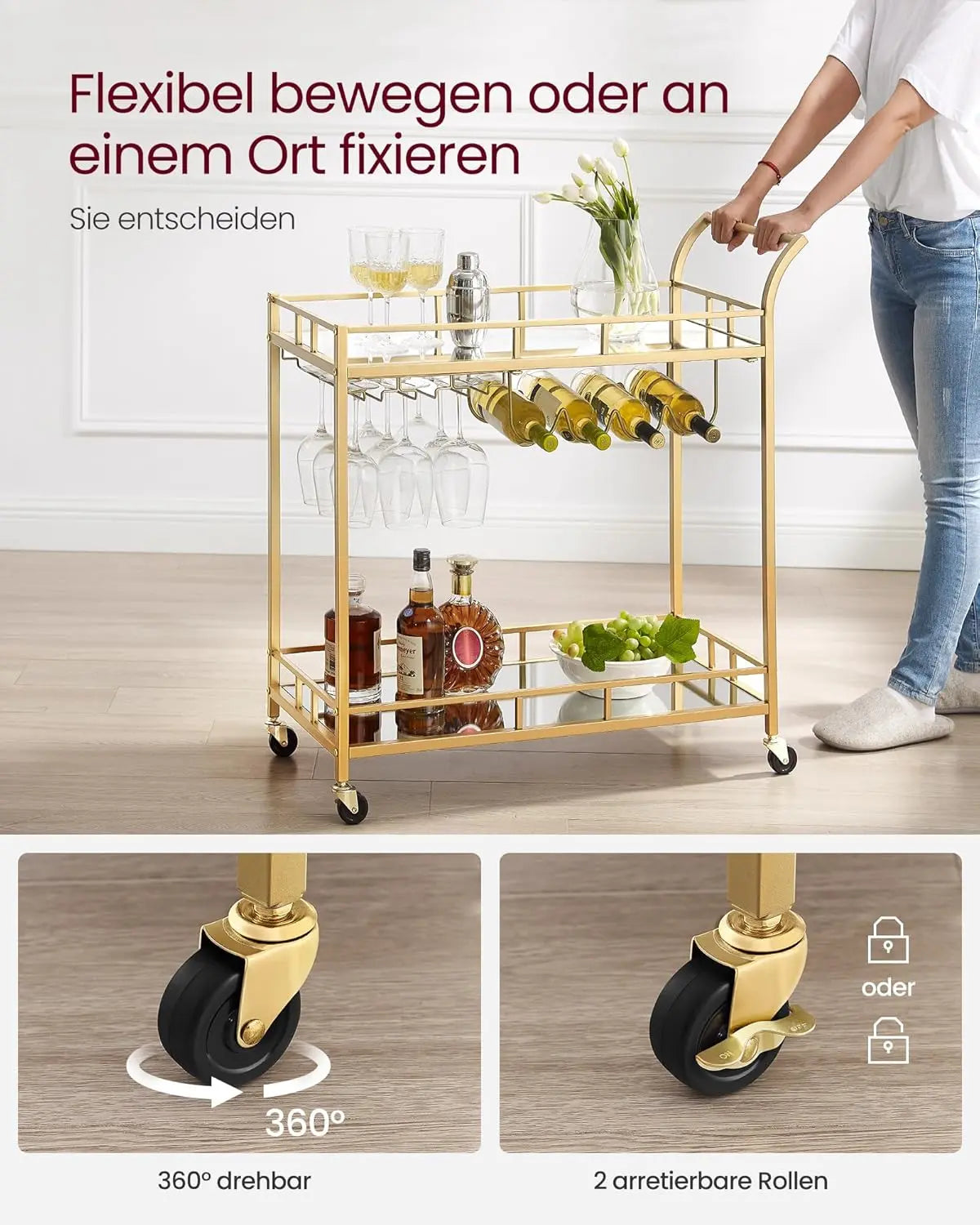 Dank der 4 Rollen, von denen 2 mit Bremsen ausgestattet sind, lässt sich der Barwagen mühelos dorthin bewegen, wo Sie ihn benötigen. Ob beim Servieren von Getränken auf der Party oder beim Kaffee nach dem Essen – dieser Wagen ist flexibel einsetzbar.