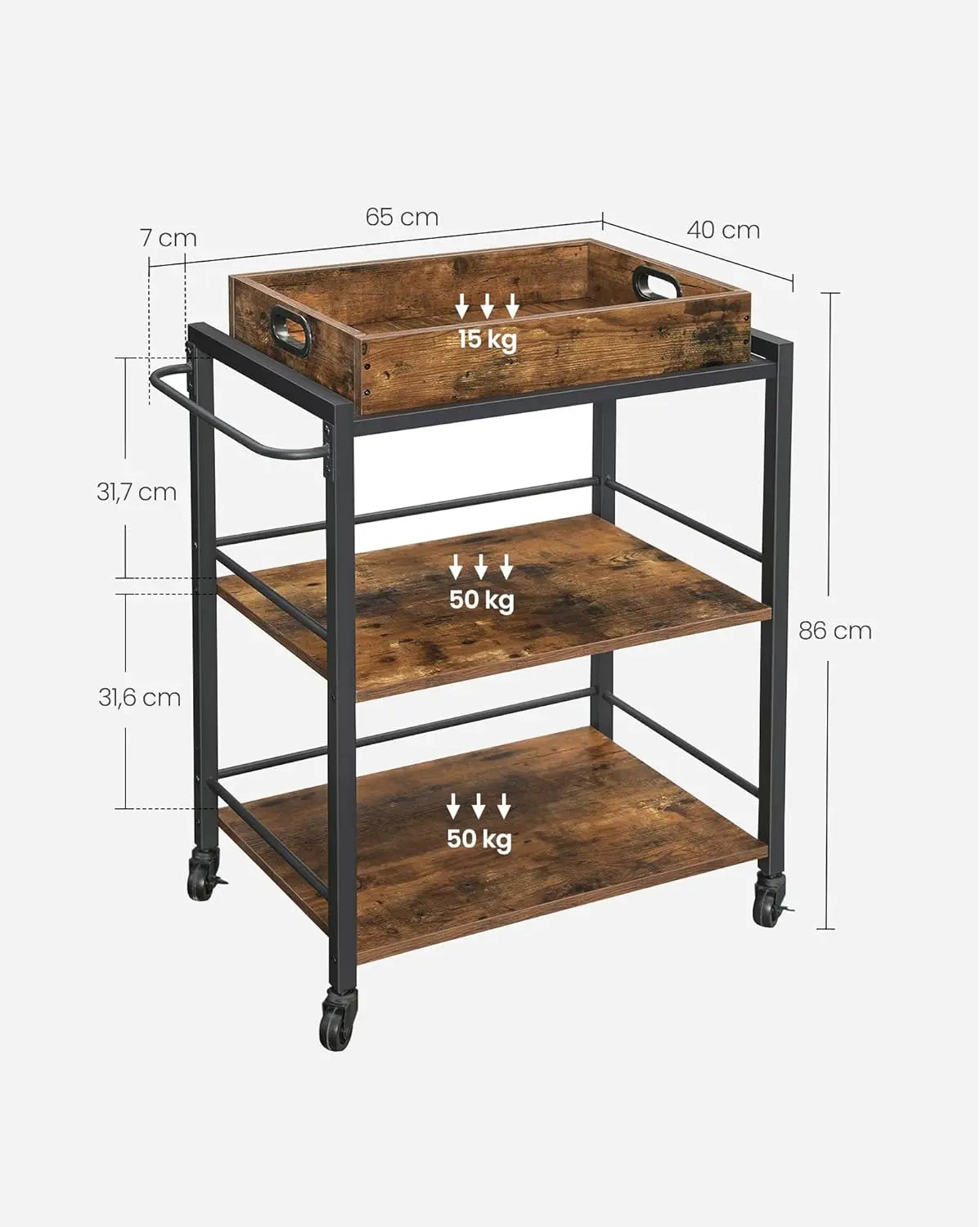 Das abnehmbare Tablett ist ein weiteres Highlight. Mit einer Belastbarkeit von bis zu 15 kg und hohen Seiten sorgt es dafür, dass alles sicher an seinem Platz bleibt – ideal für Brötchen, Snacks oder sogar ein Glas Champagner. Die drei grosszügigen Ablagen bieten ausreichend Platz für Vorspeisen, Desserts und alles, was Sie für Ihre nächste Feier benötigen. Mit einer robusten Stahlkonstruktion, die bis zu 60 kg trägt, ist dieser Servierwagen sowohl funktional als auch langlebig.