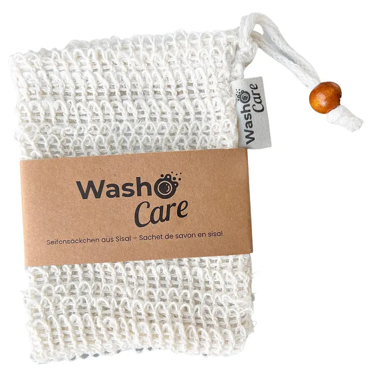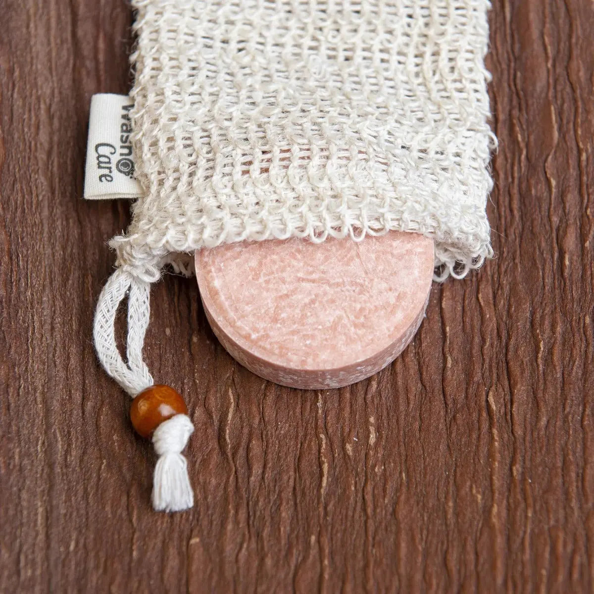 1. Washo Care feste Duschpflege oder Shampoo in das Sisalsäckchen geben und beides befeuchten.