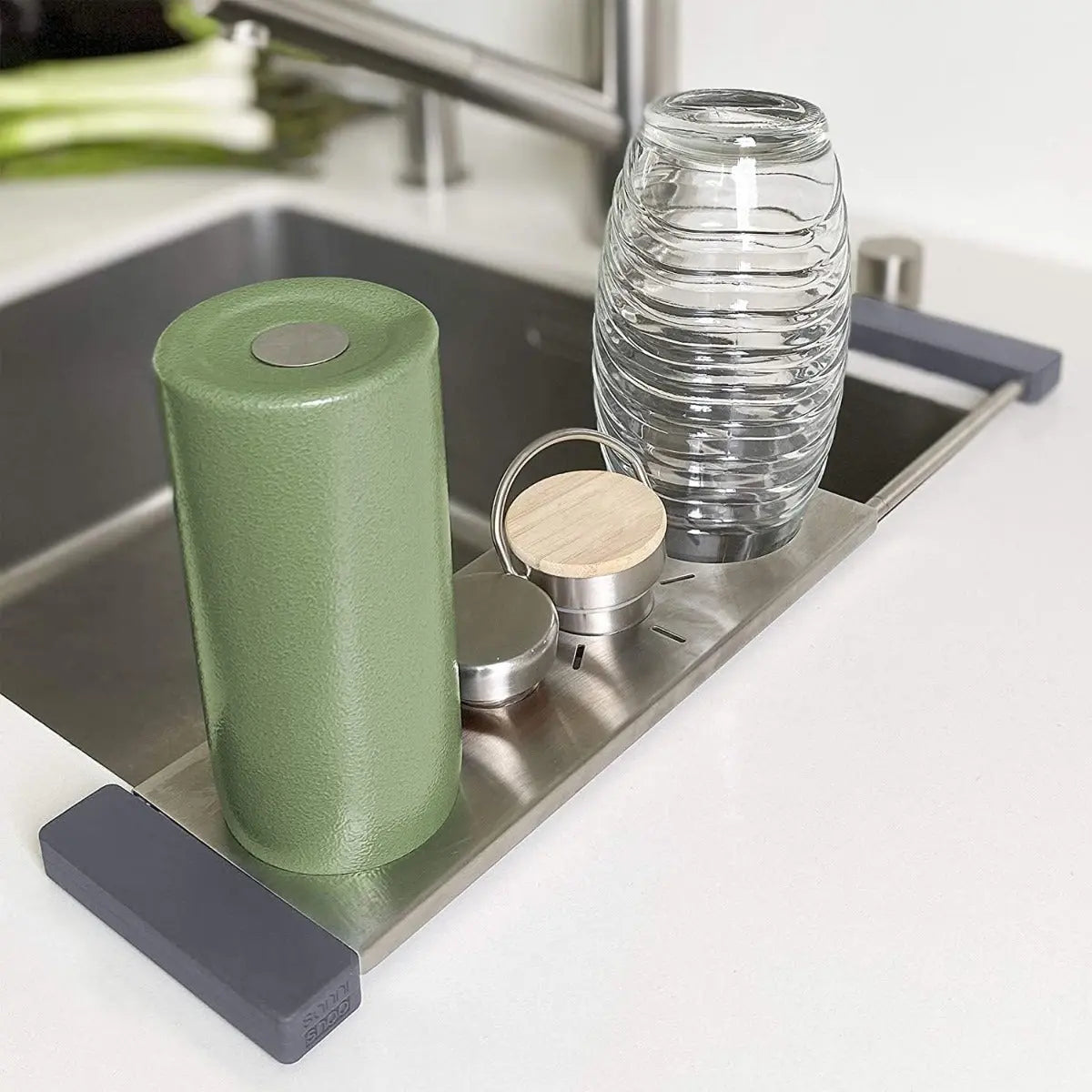 Keine nassen Oberflächen mehr – Ihre Flaschen tropfen über der Spüle ab. Das spart Abtropfwannen oder Abtropfmatten und gleichzeitig viel Platz auf der Arbeitsfläche. Der drip.it Abtropfhalter besteht aus 2 teleskopischen Edelstahl-Schienen mit lebensmittelechten Silikonenden, BPA-frei sowie abnehmbarer Flaschenaufsatz ohne scharfen Kanten aus gebürstetem Edelstahl. Ohne den Flaschenaufsatz ist drip.it eine praktischer Abtropf-Halterung für größere Tassen, Spültücher oder Bienenwachstücher. Die Edelstahlschiene mit der Sonne als Design-Objekt kann mit oder ohne Schienen auch als Untersetzer für Heißes verwendet werden. Mit drip.it haben die Erfinder der drip.line den beliebten Artikel aus der Erfindershow auf Pro7 weiterentwickelt. Drip.it nimmt den Trend der wiederverwendbaren und umweltschonenden Mehrwegflaschen auf, und gibt diesen ein neues, platzsparendes Zuhause. Geschützes Design von Fontana Design Works, erteiltes Gebrauchsmuster. Mit mehr als vier unterschiedlichen Einsatzmöglichkeiten ist drip.it ein kleines, platzsparendes Verwandlungs-Genie. Wenn über der Spüle nicht gebraucht, ist drip.it sogar ein (bis zu 230 Grad C) hitzebeständiger Untersetzer. Ideal daher für kleine Küchen, tiny houses oder Camping und Wohnwagen.