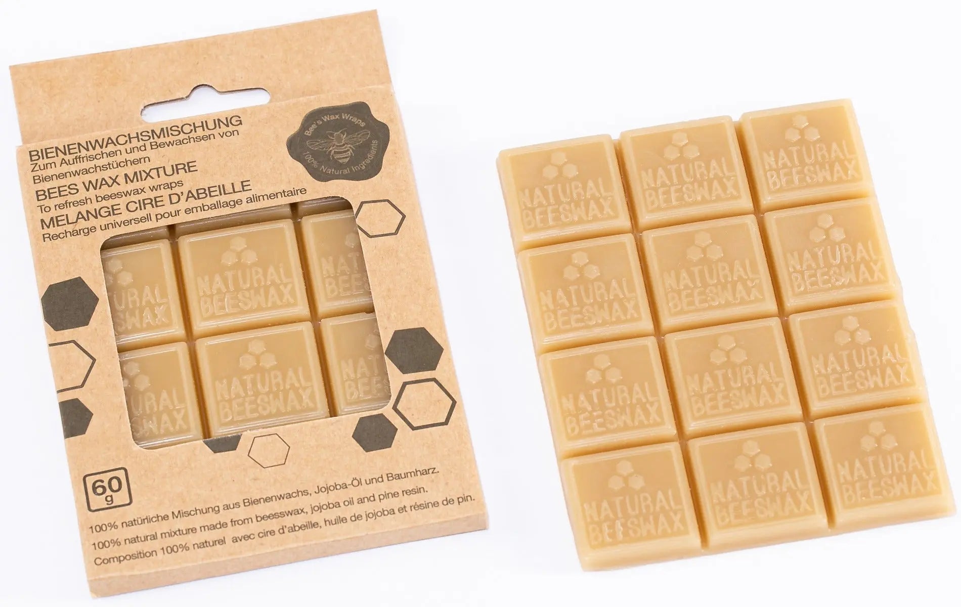 Die Bienenwachsmischung besteht aus Bio-Bienenwachs, Kokosöl und Baumharz Speziell für das Bewachsen und Auffrischen von Baumwolltextilien konzipiert. Die Inhaltsstoffe sind lebebensmittelecht, biologisch und frei von Pestiziden. Reparieren: Bienenwachstücher halten bei guter Pflege ca 1 Jahr. Durch eine regelmässige Nutzung und Reinigung, verlieren Bienenwachstücher mit zunehmender Dauer an Haftung. Mit der Repair-Wachsmischung kann diese einfach wieder hergestellt werden. Herstellen: Für die Herstellung eigener Bienenwachstücher benötigts man nur 1 Stück (5 Gramm) der Repair-Tafel Bienenwachsmischung pro 150-300cm2 Baumwolltuch. Die genaue Menge hängt vom Gewicht des Tuches ab. Zum Herstellen von eigenen Bienenwachstüchern empfehlen wir unbedruckten, sehr dünnen Bio-Baumwollstoff ohne Kunstfasern. Im Backofen: Backofen auf 80°C vorheizen Backpapier auf das Backblech legen und das zu reparierende Wachstuch bzw. neue Baumwolltuch darauf legen. Mit einer Käsereibe die Bienenwachsmischung auf das Tuch reiben und gleichmässig verteilen. 5 min backen Das Backblech aus dem Ofen nehmen und den flüssigen Wachs mit einem Pinsel gleichmässig verteilen. Abkühlen lassen und fertig! Mit dem Bügeleisen: Backpapier auf eine flache Oberfläche legen, das Wachstuch bzw. Baumwolltuch darauf legen. Mit einer Käsereibe die Bienenwachsmischung auf das Tuch reiben und gleichmässig verteilen und ein 2. Backpapier darauf platzieren. Die Bienenwachmischung mit dem Bügeleisen einbügeln. Abkühlen lassen, das Backpapier entfernen und fertig!