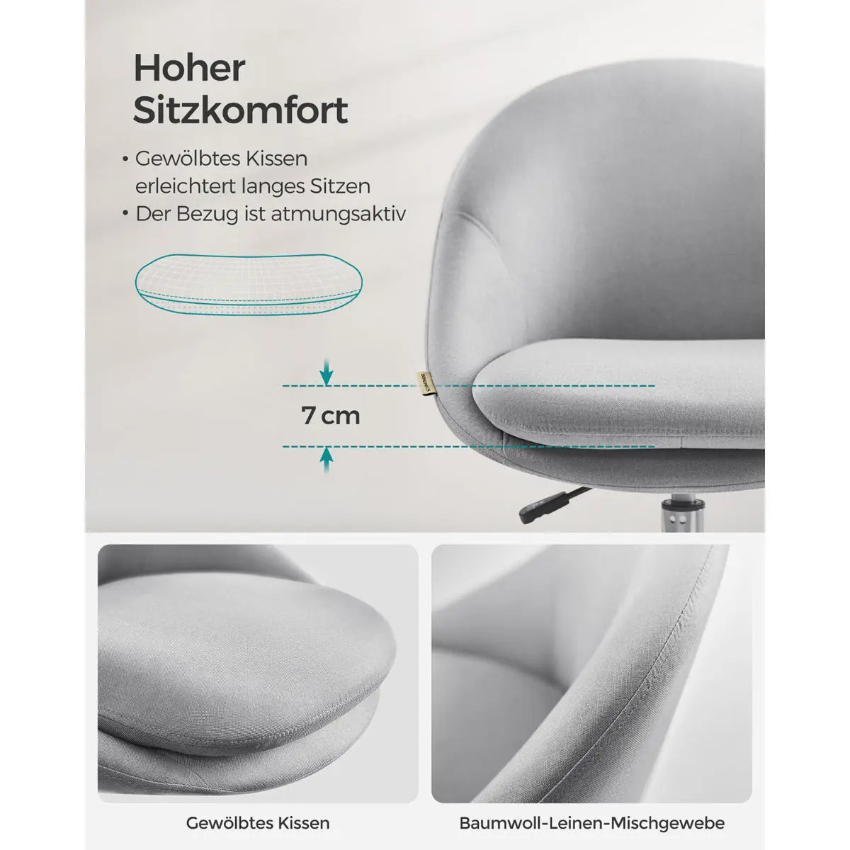 Der weiche, atmungsaktive Baumwoll-Leinenbezug kombiniert mit der doppelt gepolsterten Sitzfläche (Gesamtdicke 12 cm, oberes Kissen 7 cm) sorgt für ein angenehmes Sitzgefühl, auch bei längerem Gebrauch. Die grosszügige, leicht gebogene Sitzfläche entlastet Ihre Hüften, während die 360° drehbaren Rollen maximale Bewegungsfreiheit bieten.