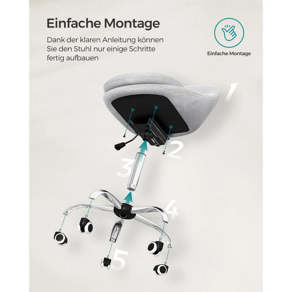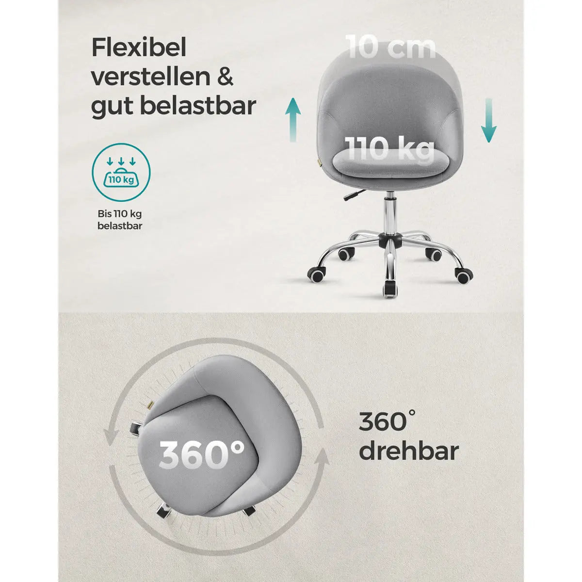 Höhenverstellbar 47–57 cm für individuelle Sitzposition, 360° drehbar mit Rollen für maximale Bewegungsfreiheit, Kompakt ohne Armlehnen zum platzsparenden Verstauen