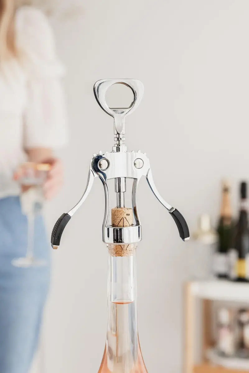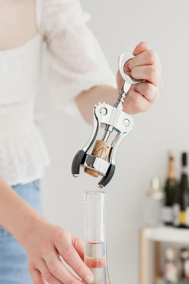 Der Korkenzieher verfügt über ergonomische Griffe und ein verstärktes Zahnrad-System, das das Entkorken mühelos gestaltet. Der scharfe Korkenzieher durchdringt selbst härteste Korken problemlos. Zusätzlich ist ein integrierter Flaschenöffner vorhanden, der ihn zu einem vielseitigen Werkzeug für jede Bar macht. Ideal für Weinliebhaber und Biergeniesser gleichermassen.