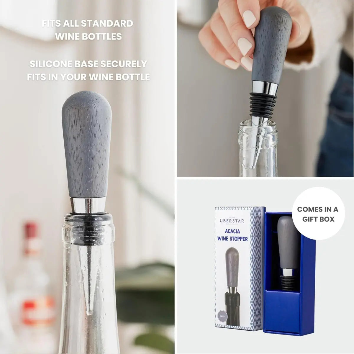 Ein guter Wein verdient einen passenden Verschluss – besonders dann, wenn nicht die ganze Flasche auf einmal geleert wird. Der Weinflaschenverschluss Akazie Grau von Uberstar ist die stilvolle Lösung für alle, die Wein gerne bewusst geniessen – und ihn dennoch frisch halten möchten.