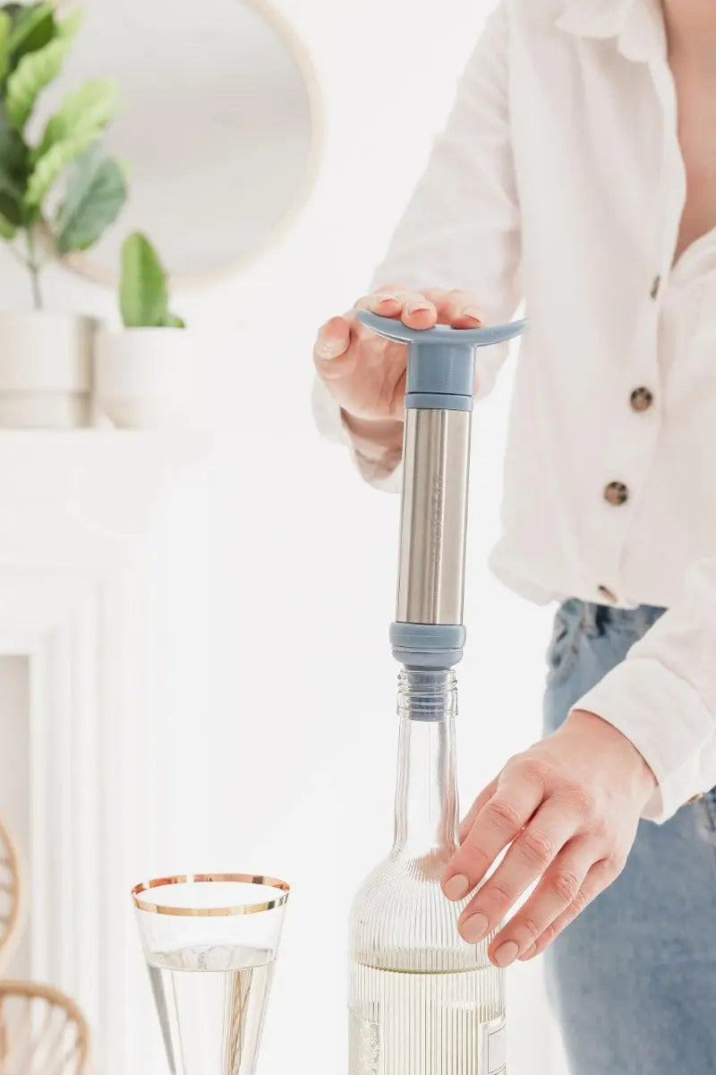 Die Bedienung erfolgt manuell und ohne Batterien: Der Stopfen wird in die Flasche eingesetzt, und die Pumpe extrahiert die Luft, wodurch der Wein bis zu 10 Tage länger frisch bleibt.