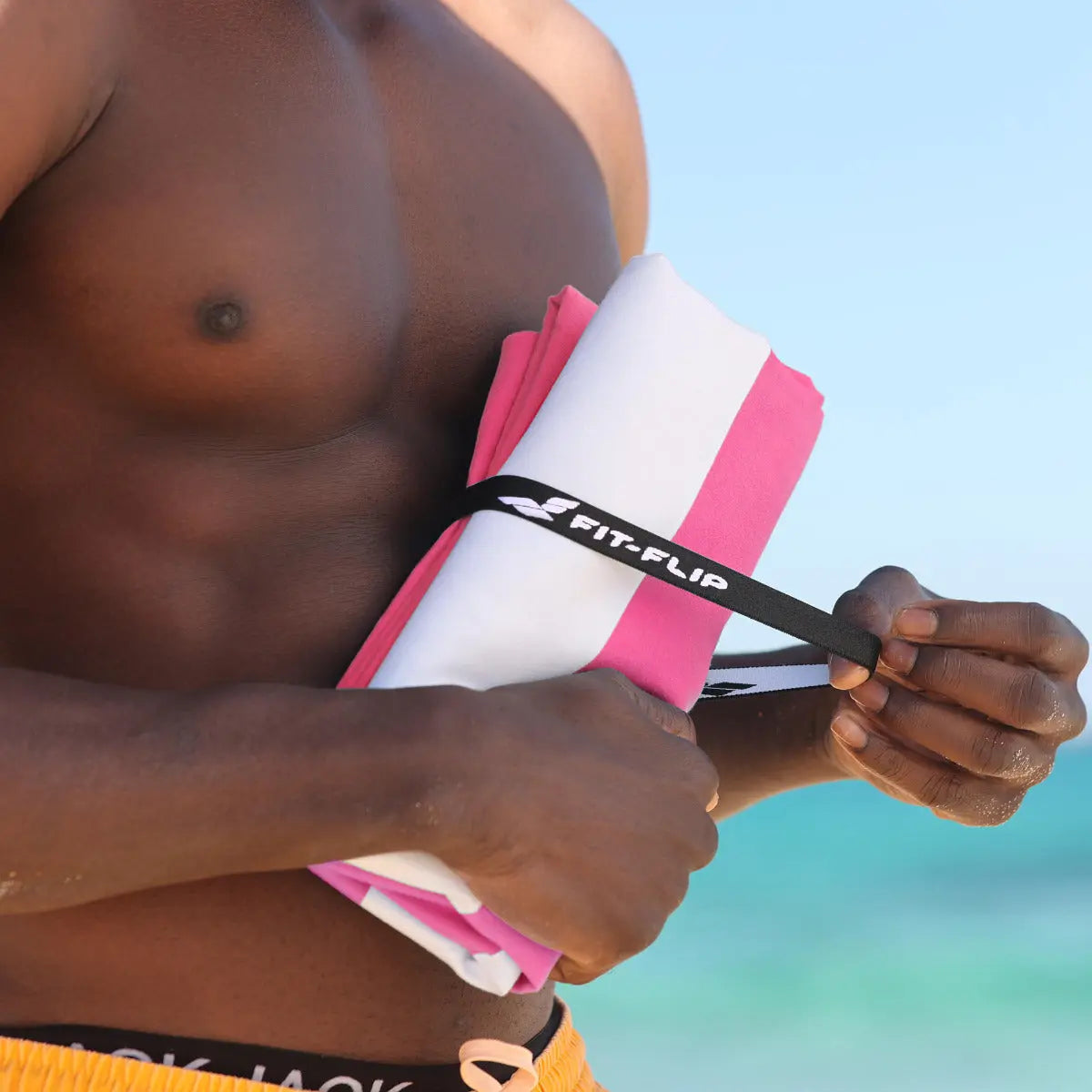 Erhältlich in zwei verschiedenen Grössen und einer Vielzahl von Farben, kannst du das Fit-Flip Strandtuch passend zu deinen Bedürfnissen und deinem Stil auswählen. Der Lieferumfang beinhaltet eine praktische Tragetasche, die den Transport erleichtert und das Tuch vor Verschmutzungen schützt. Ob für den Strandurlaub, den Besuch im Schwimmbad oder als Reisehandtuch – dieses vielseitige Accessoire ist ein Muss für alle, die Wert auf Qualität und Funktionalität legen.
