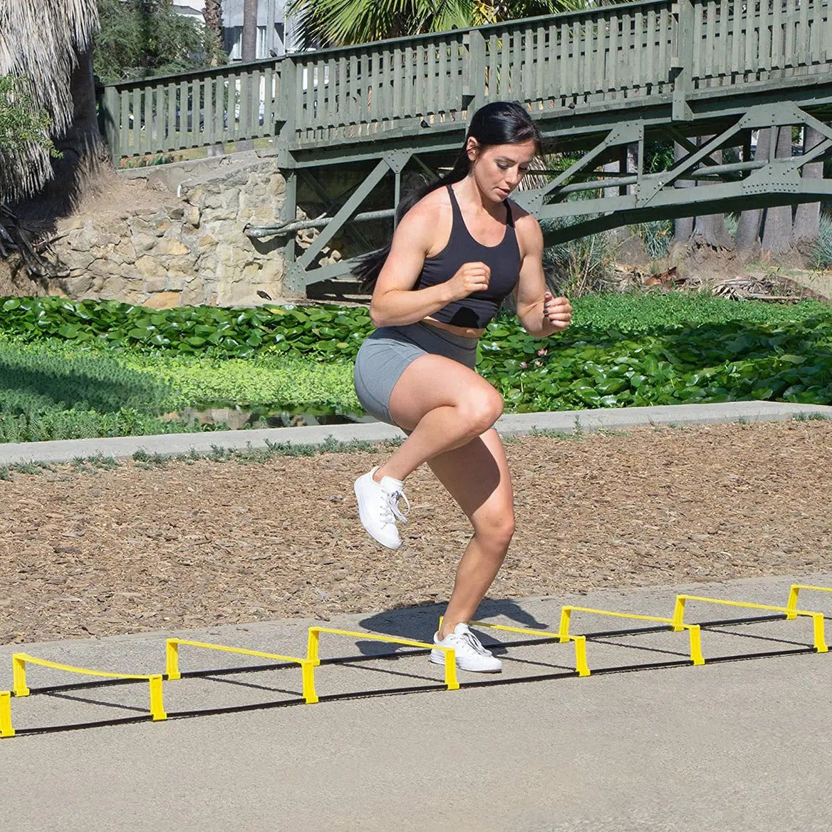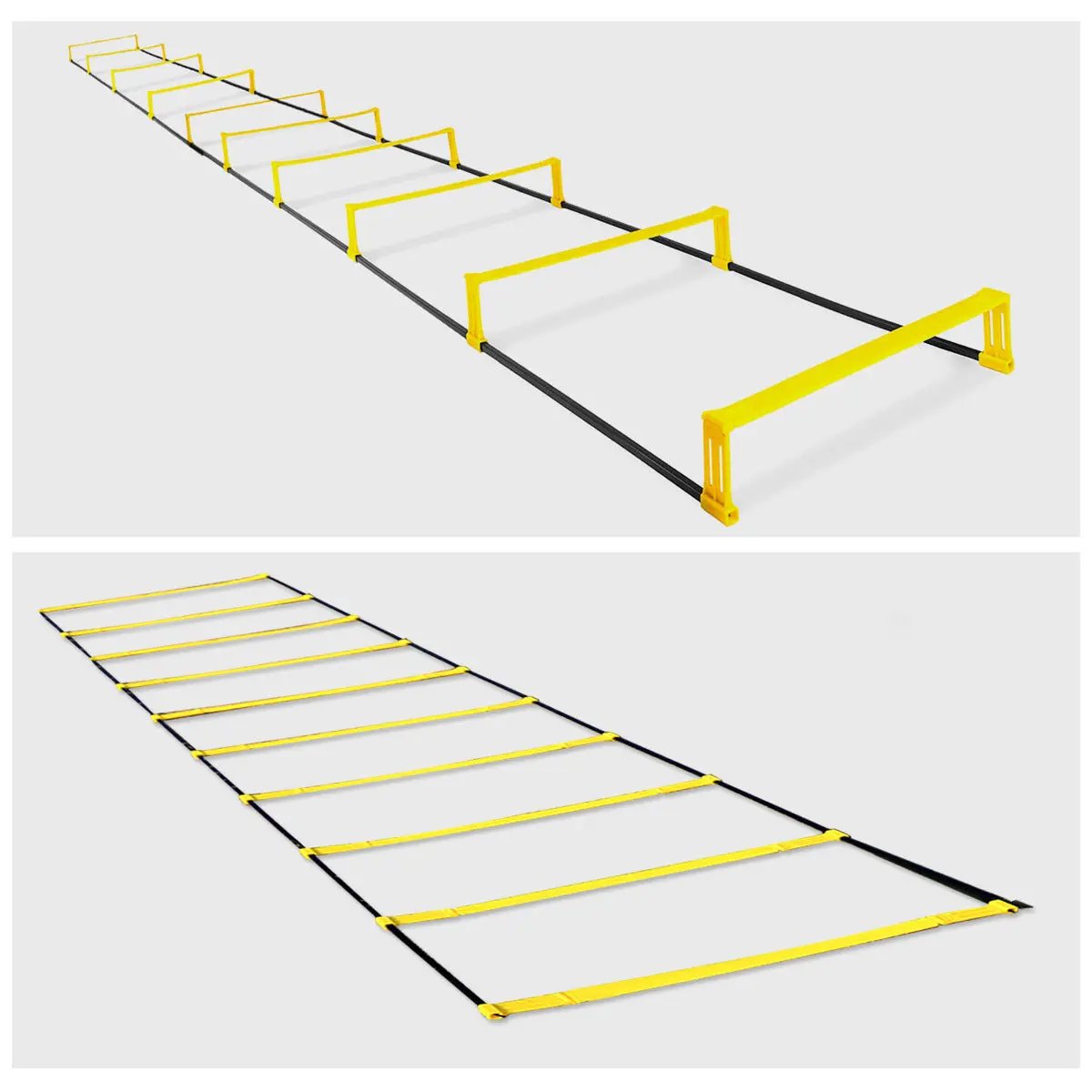 Gefertigt aus hochfestem Kunststoff und flexiblen Gummistreifen, hält die Leiter selbst intensiven Trainingseinheiten problemlos stand. Mit einer Dicke von 5 mm bietet sie eine robuste und rutschfeste Plattform – sowohl für Indoor- als auch Outdoor-Workouts. Die Struktur ist flexibel, lässt sich einfach zusammenfalten und überall mitnehmen.