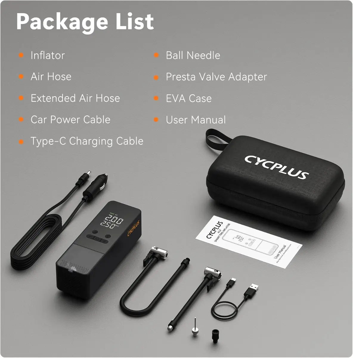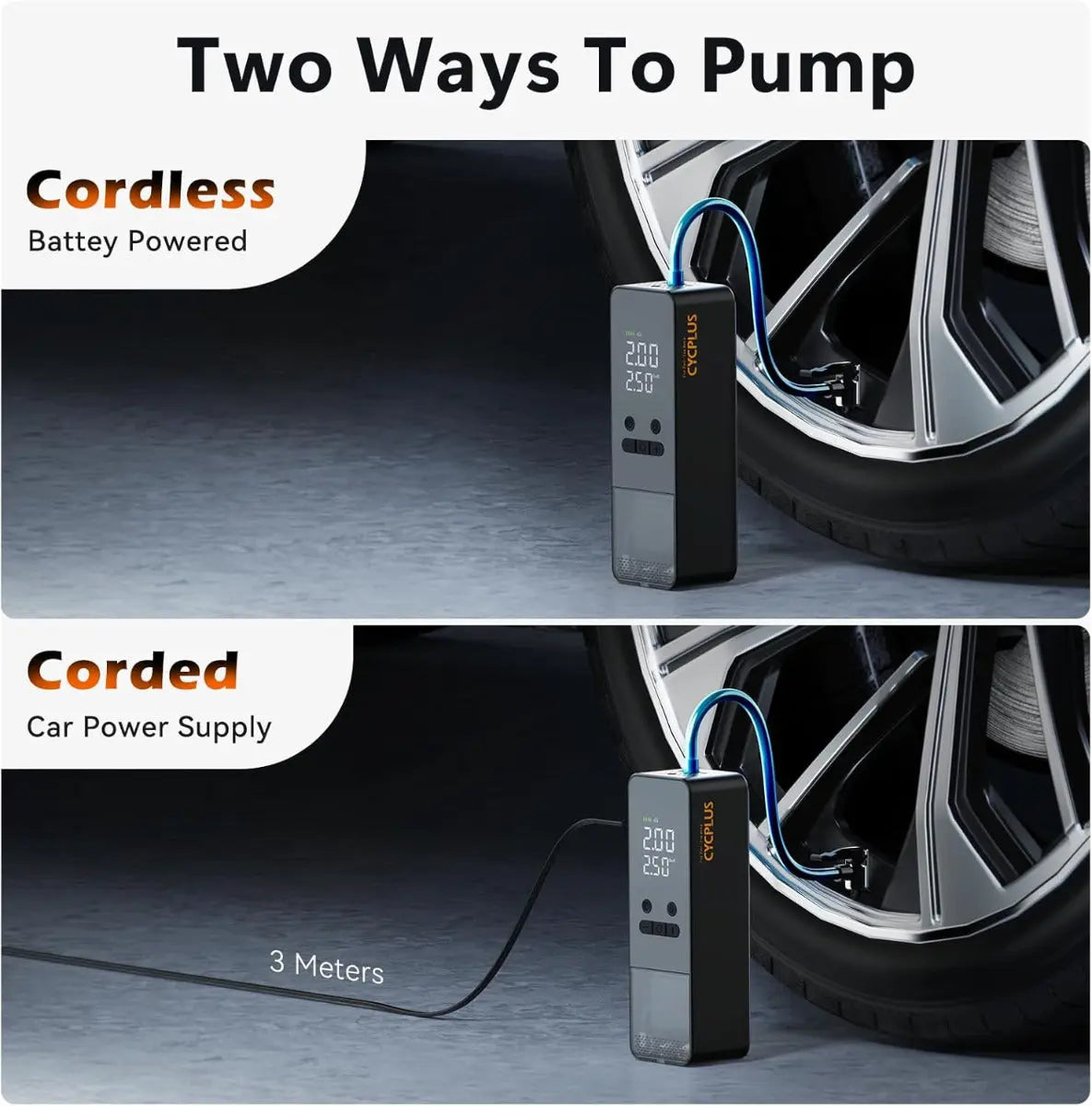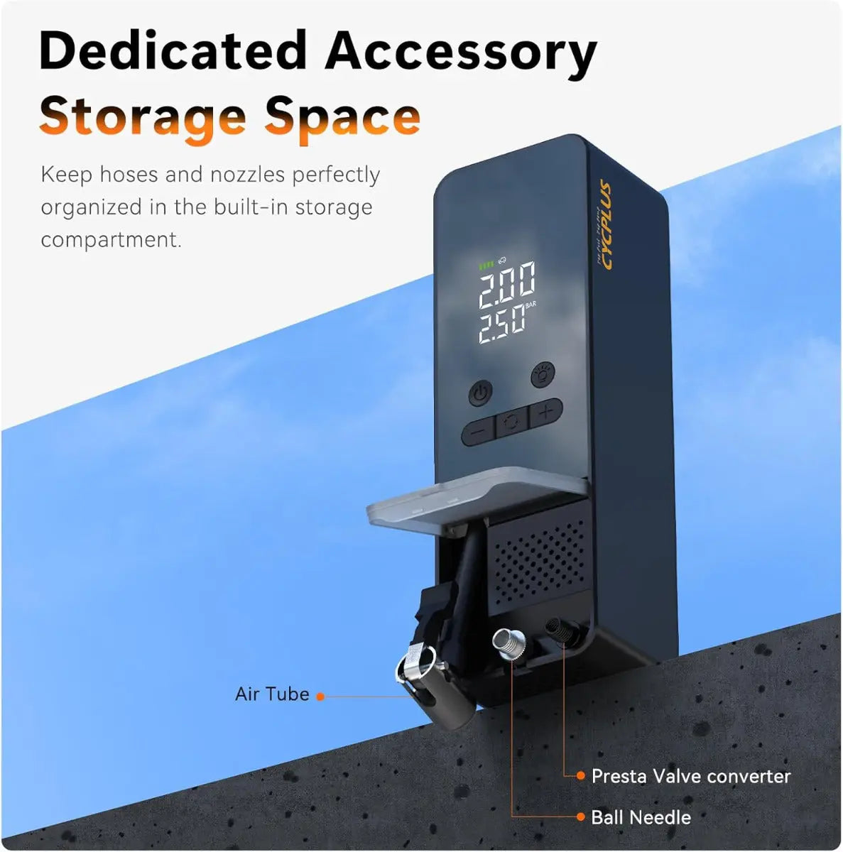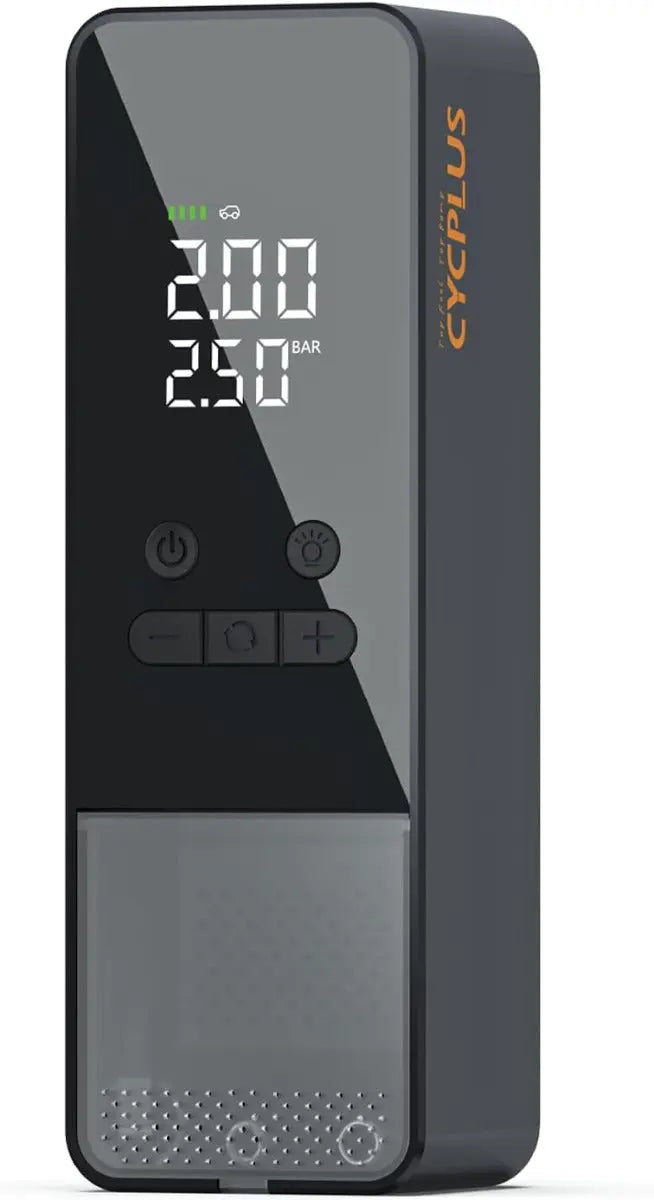 Die CYCPLUS AL3 ist ein kompakter, tragbarer Kompressor mit bis zu 150 PSI Druck und eignet sich perfekt für Auto-, Motorrad-, Fahrrad- und E-Bike-Reifen sowie Bälle. Mit LED-Digitalanzeige, voreingestellten Modi und Dual-Stromversorgung (Akku oder 12V-DC) sorgt sie für schnelles, sicheres und flexibles Aufpumpen unterwegs.