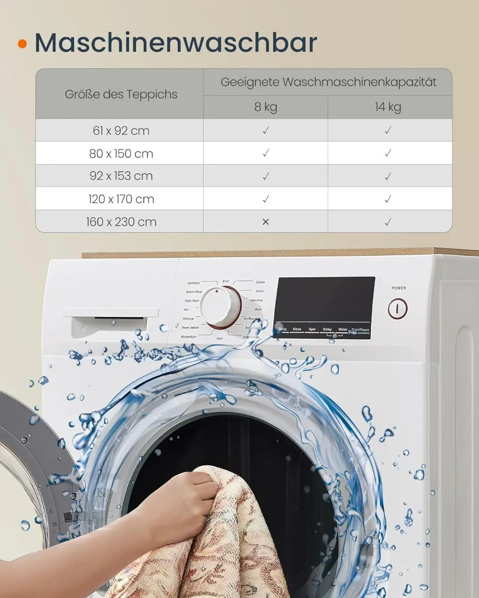 Besonderen Halt gewährleistet die rutschfeste TPR-Rückseite (thermoplastischer Gummi), die für Stabilität auf glatten Böden sorgt – ganz ohne zusätzliche Unterlage. Der Teppich ist maschinenwaschbar und lässt sich besonders leicht reinigen, was ihn ideal für Haushalte mit Kindern, Haustieren oder stark frequentierte Bereiche macht.