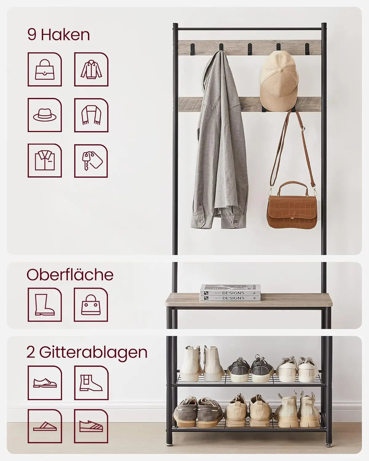 Der Garderobenständer bietet alles, was Sie brauchen: Nach einem langen Arbeitstag können Sie ganz bequem Ihren Mantel, Hut und Schal an den 9 praktischen Haken aufhängen. Setzen Sie sich auf die komfortable Sitzfläche, um Ihre Schuhe auszuziehen, und nutzen Sie die zwei stabilen Gitterablagen, um Ihre Schuhe ordentlich zu verstauen.