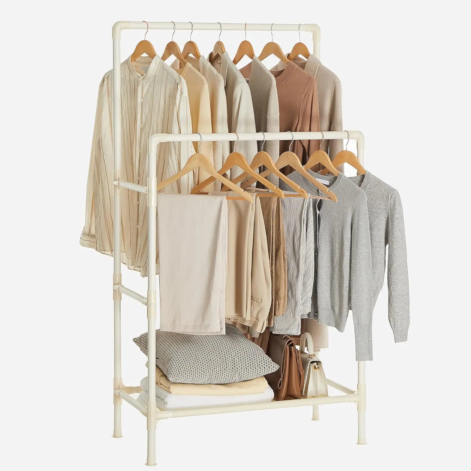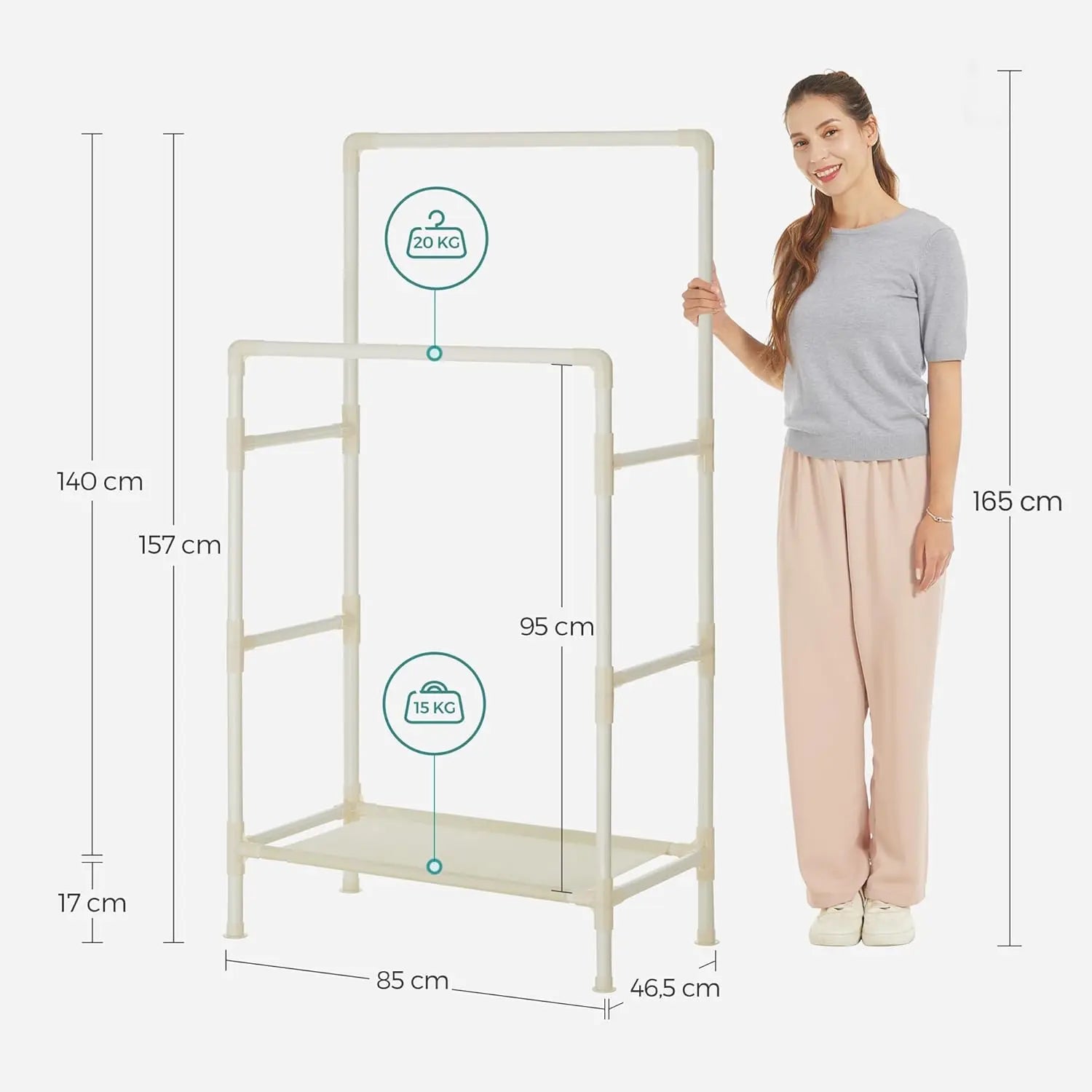 Robuste Metallkonstruktion bis 55 kg, Doppelstange trennt Hemden und Hosen, Ablage für Schuhe und werkzeugfreie Montage