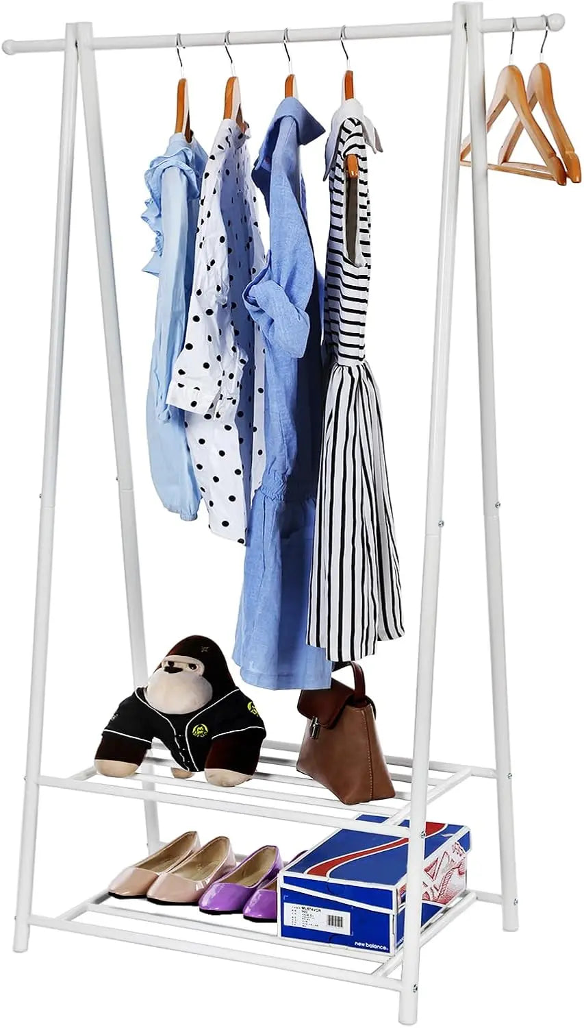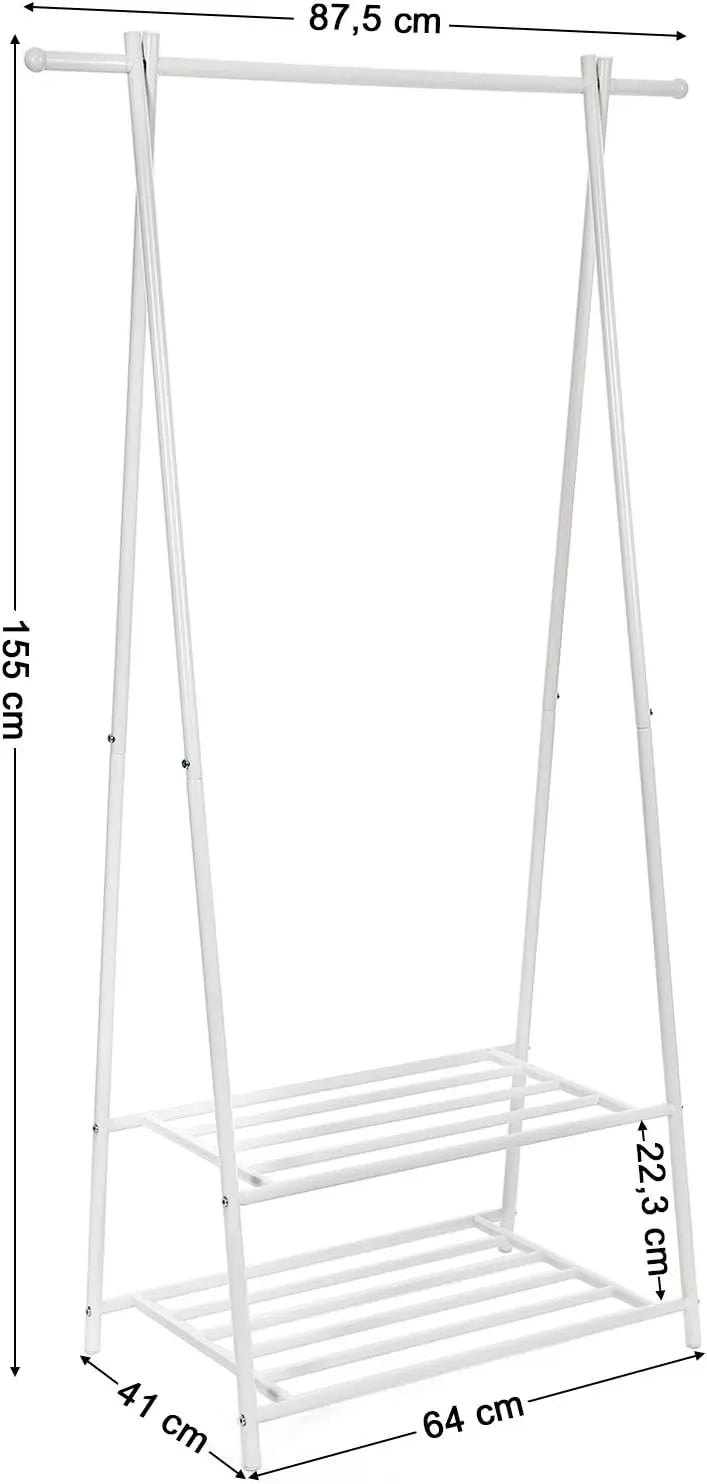 Das durchdachte Design des Kleiderständers überzeugt nicht nur durch seine Ästhetik, sondern auch durch Stabilität. Die A-förmige Eisenstruktur verjüngt sich nach oben und wird durch zwei robuste Regale verstärkt, die eine Tragfähigkeit von bis zu 20 kg für die Kleiderstange und 25 kg pro Regal bieten. So können Sie mühelos Kleidung, Hüte, Krawatten und viele weitere Accessoires unterbringen.