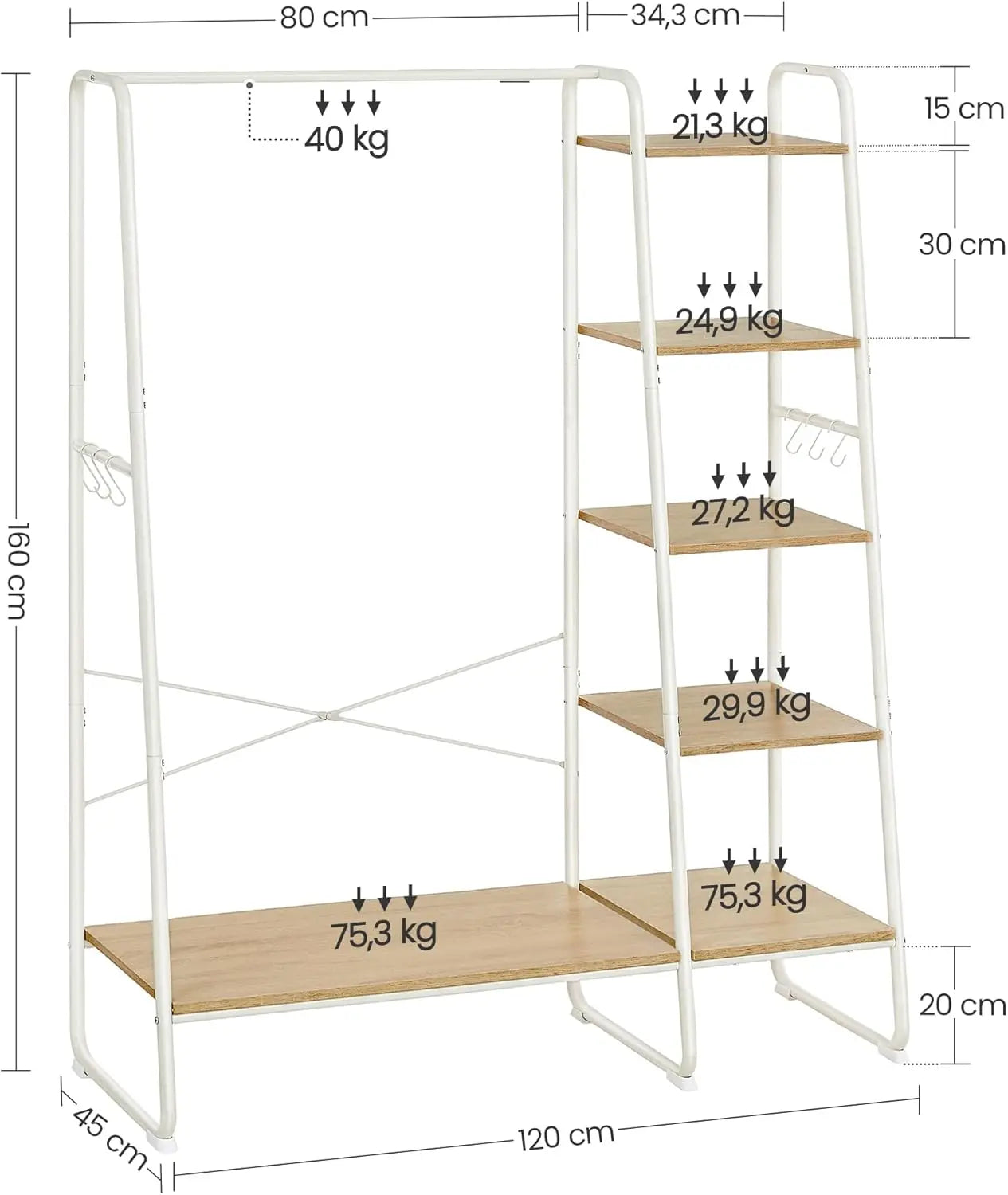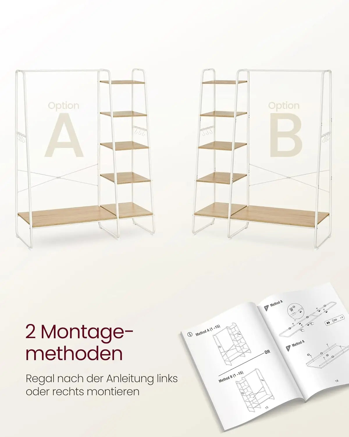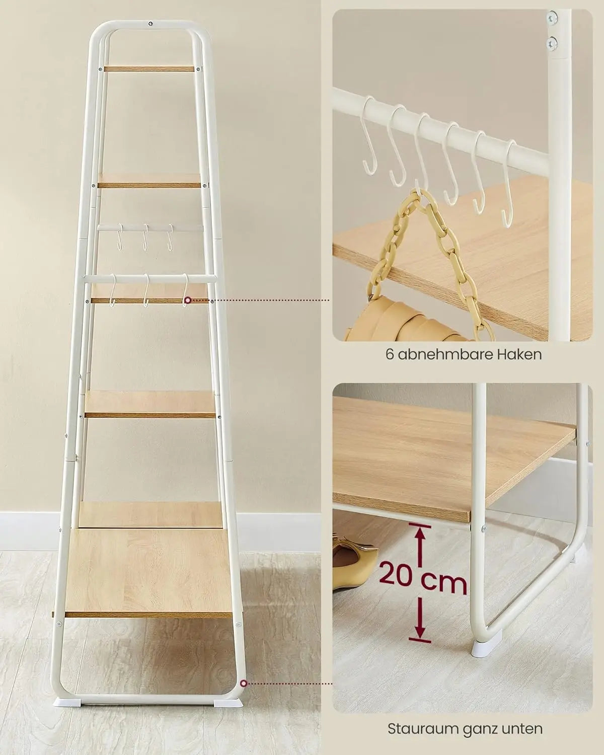 Viel Stauraum für Kleidung, Taschen und Schuhe, Stabile Konstruktion bis 220 kg mit A‑Rahmen und X‑Streben, Flexible Regalpositionierung und abnehmbare Haken für Accessoires