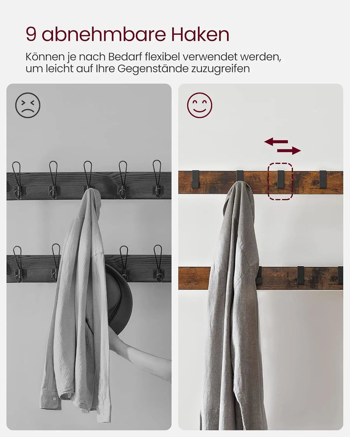Die durchdachte Gestaltung bietet Ihnen nicht nur 9 abnehmbare Haken, die jeweils bis zu 3 kg tragen können, sondern auch eine praktische Stange für Ihre Jacken. Unten erwartet Sie ein grosszügiges, zweistöckiges Schuhregal, das Ihnen hilft, Ordnung zu halten und Ihre Schuhe stilvoll zu präsentieren. Setzen Sie sich einfach auf die bequeme Bank, um Ihre Schuhe anzuziehen – so wird der Alltag zum Kinderspiel!