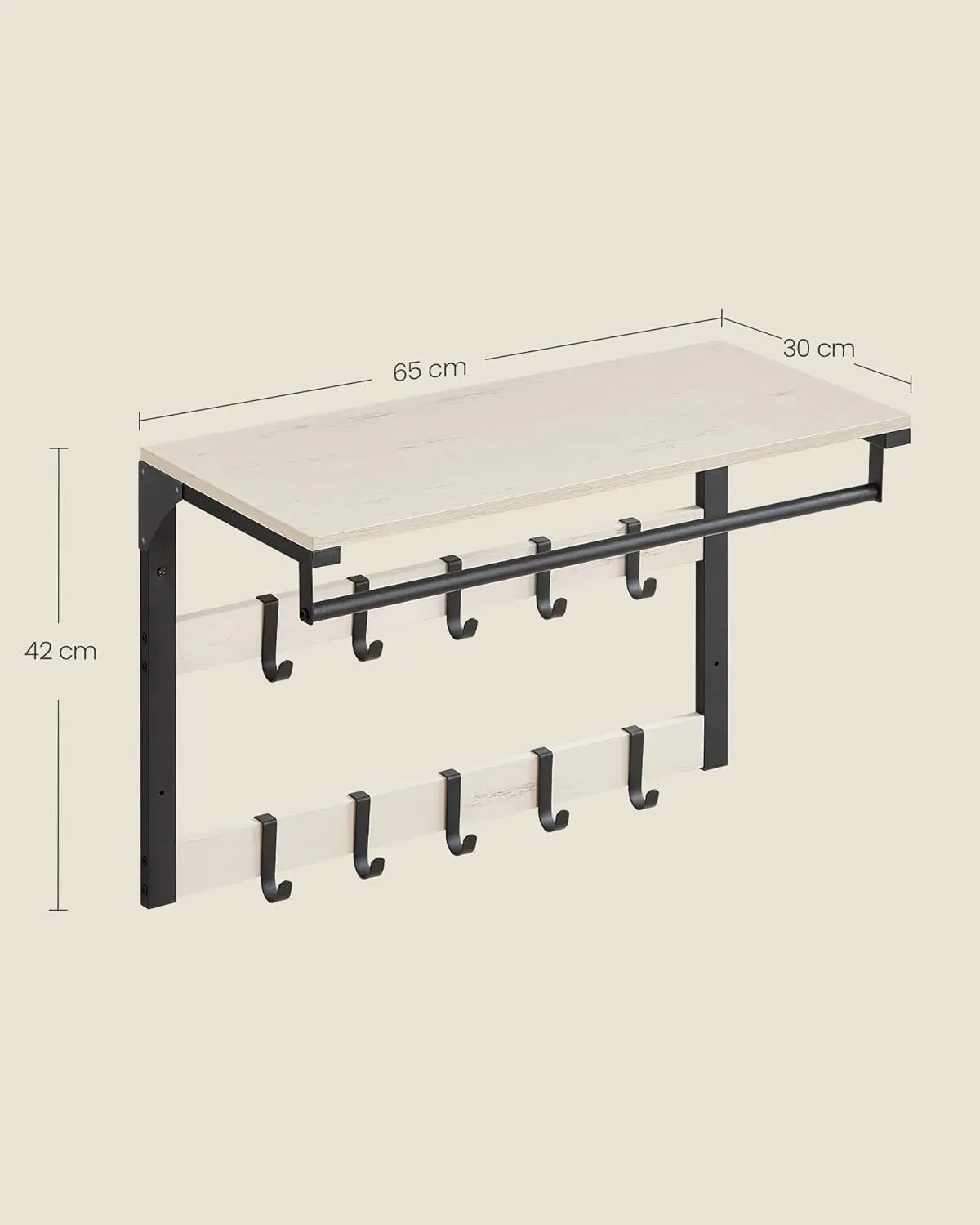 Die Wandgarderobe bietet nicht nur einen eleganten Look, sondern auch praktische Funktionen. Der obere Regalboden eignet sich ideal für die Aufbewahrung kleiner Gegenstände, während die 10 abnehmbaren Haken in Doppelreihen Ihnen die Flexibilität geben, den Abstand je nach Bedarf anzupassen. Ob Taschen, Jacken oder Schals – alles findet seinen Platz!