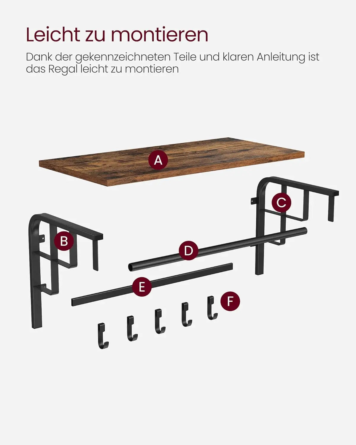 Platzsparende 3‑in‑1-Lösung mit Regal, Kleiderstange und fünf abnehmbaren Haken, Hohe Tragfähigkeit (Oberseite 15 kg, Leiste 10 kg, Haken je 2,3 kg), Einfache Montage dank bebilderter Anleitung und nummerierter Teile