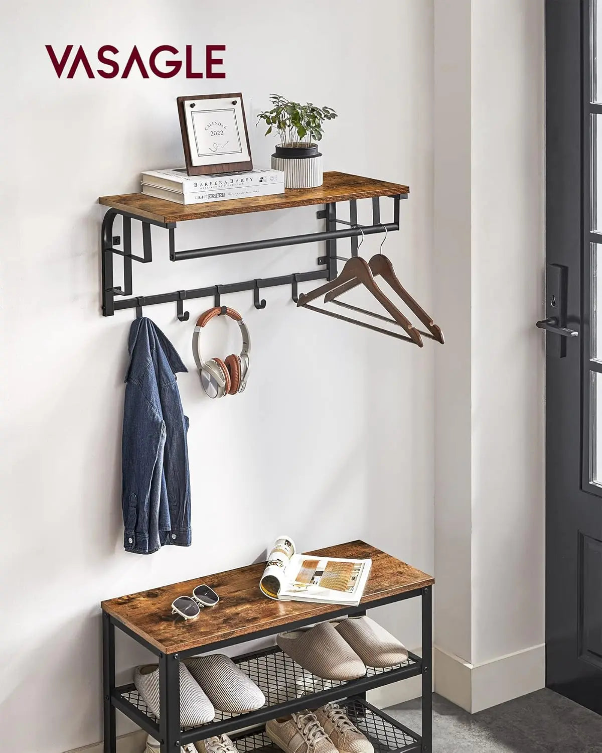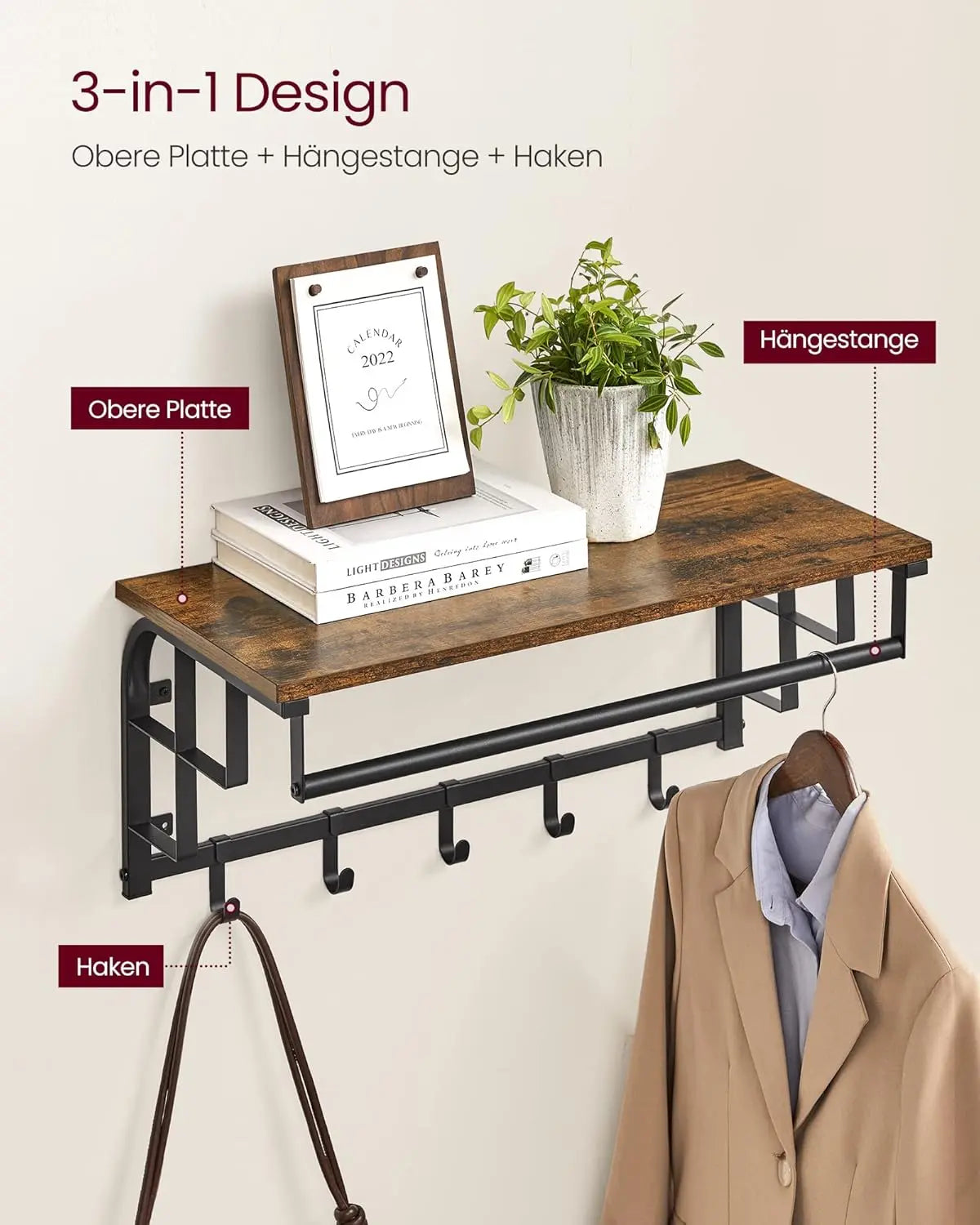 Entdecken Sie die SONGMICS Wandgarderobe mit Aufbewahrungsregal – die perfekte Lösung für stilvolle und praktische Aufbewahrung in Ihrem Zuhause. Dieses 3-in-1 Möbelstück kombiniert ein grosszügiges Regal (30 x 66 cm), eine Kleiderstange und fünf abnehmbare Haken, um all Ihre Aufbewahrungsbedürfnisse zu erfüllen. Ob Jacken, Taschen, Regenschirme oder Schlüssel – alles findet hier seinen Platz.