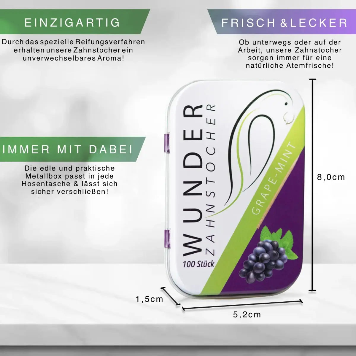 Zahnstocher mit Traube Minze Geschmack. Frischer Atem garantiert! Lieferumfang: 1x edle Metallbox. Verpackungsinhalt: 100 Zahnstocher. 100% Handmade in Germany! Mit jedem Kauf spendest Du automatisch an unser Wunder-Bienenvolk und leistest dadurch einen wertvollen Beitrag für den Erhalt unseres gesamten Ökosystems! Bestandteile: Birkenzahnstocher, Nat. Lebensmittelaroma, Glycerin, Süßungsmittel.
