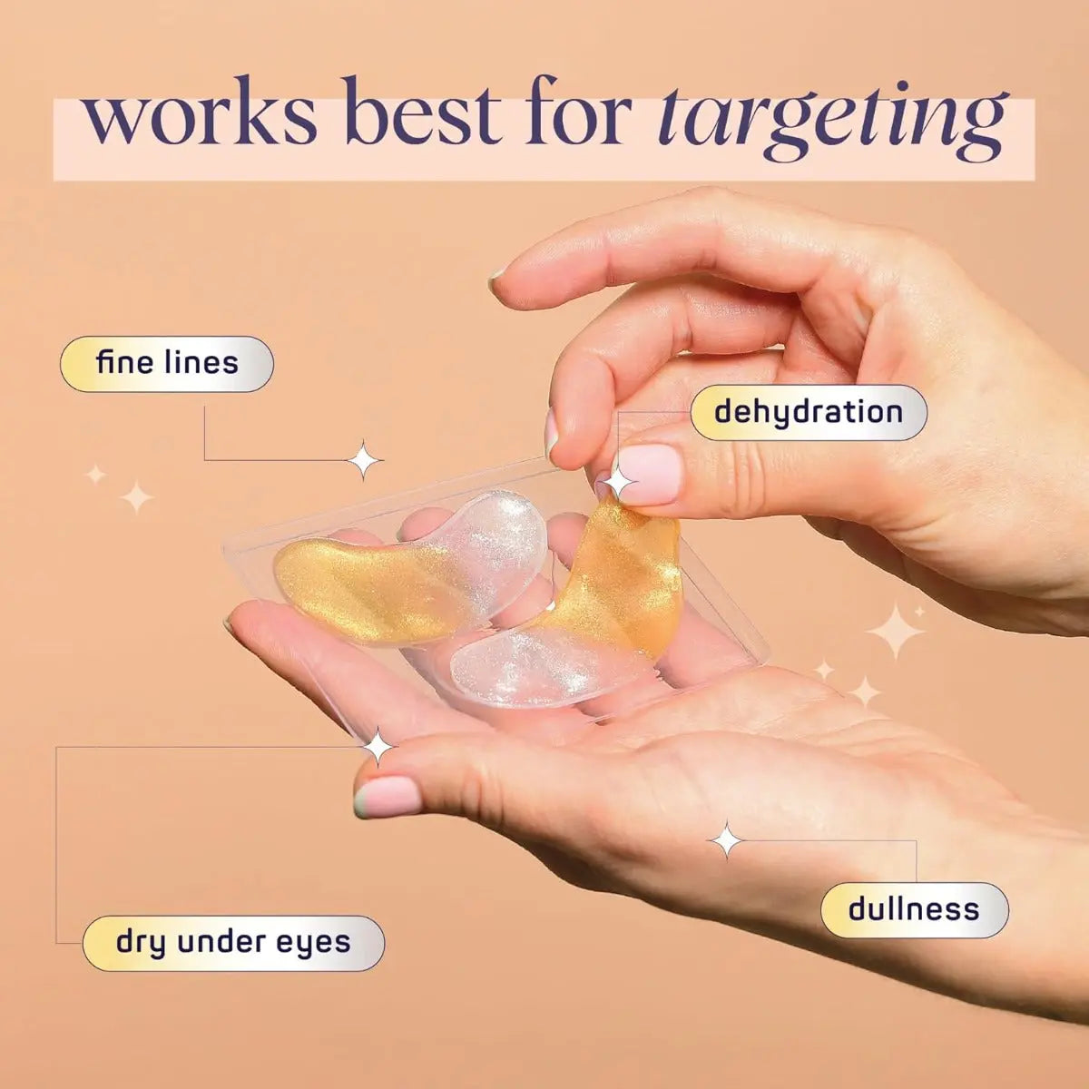 Strahle mit diesen 2-in-1-Ombré-Hydrogel-Masken, die mit 24-karätigem Gold zur Förderung der Kollagenproduktion und kolloidalem Silber zum Schutz vor oxidativem Stress angereichert sind. Die Masken helfen, feine Linien zu glätten, trockene Augenpartien zu hydratisieren, und einen strahlenden Teint zu verleihen. Trage die Maske auf die gereinigte, trockene Augenpartie auf, lasse sie 15 bis 20 Minuten einwirken, und massiere das überschüssige Serum ein. Für optimalen Schutz vor freien Radikalen empfehlen wir die Anwendung vor längeren Aufenthalten im Freien.