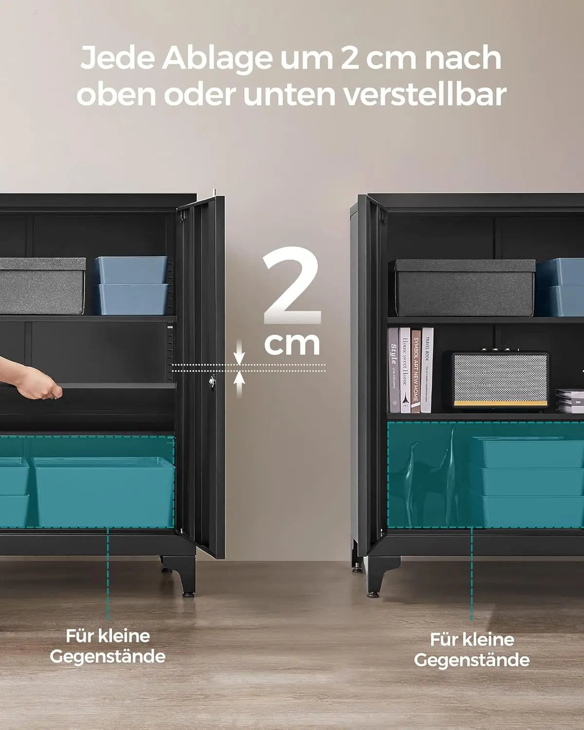 Das matte Schwarz fügt sich unaufdringlich in unterschiedliche Einrichtungsstile ein und macht den Schrank zu einem vielseitigen Allrounder für Privathaushalt und Gewerbe. Sicherheit hat Priorität: Das hochwertige Stahlschloss ist rostfrei, verschleissfest und wird mit zwei Schlüsseln geliefert, sodass persönliche oder sensible Gegenstände zuverlässig geschützt sind. Die Montage ist einfach und schnell: Klar verständliche Anleitung, gekennzeichnete Einzelteile und ein mitgeliefertes Zubehörkit sorgen dafür, dass der Schrank mühelos aufgebaut werden kann. Praktische Details wie die optional montierbaren Beine mit verstellbaren Schraubfüssen ermöglichen Ihnen die Wahl, ob Sie den Schrank bodennah oder erhöht nutzen möchten; die Schraubfüsse sorgen für Stabilität auch auf leicht unebenem Untergrund.