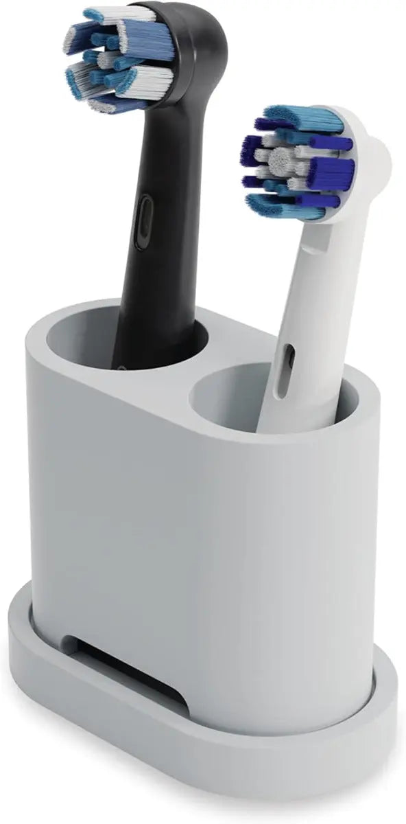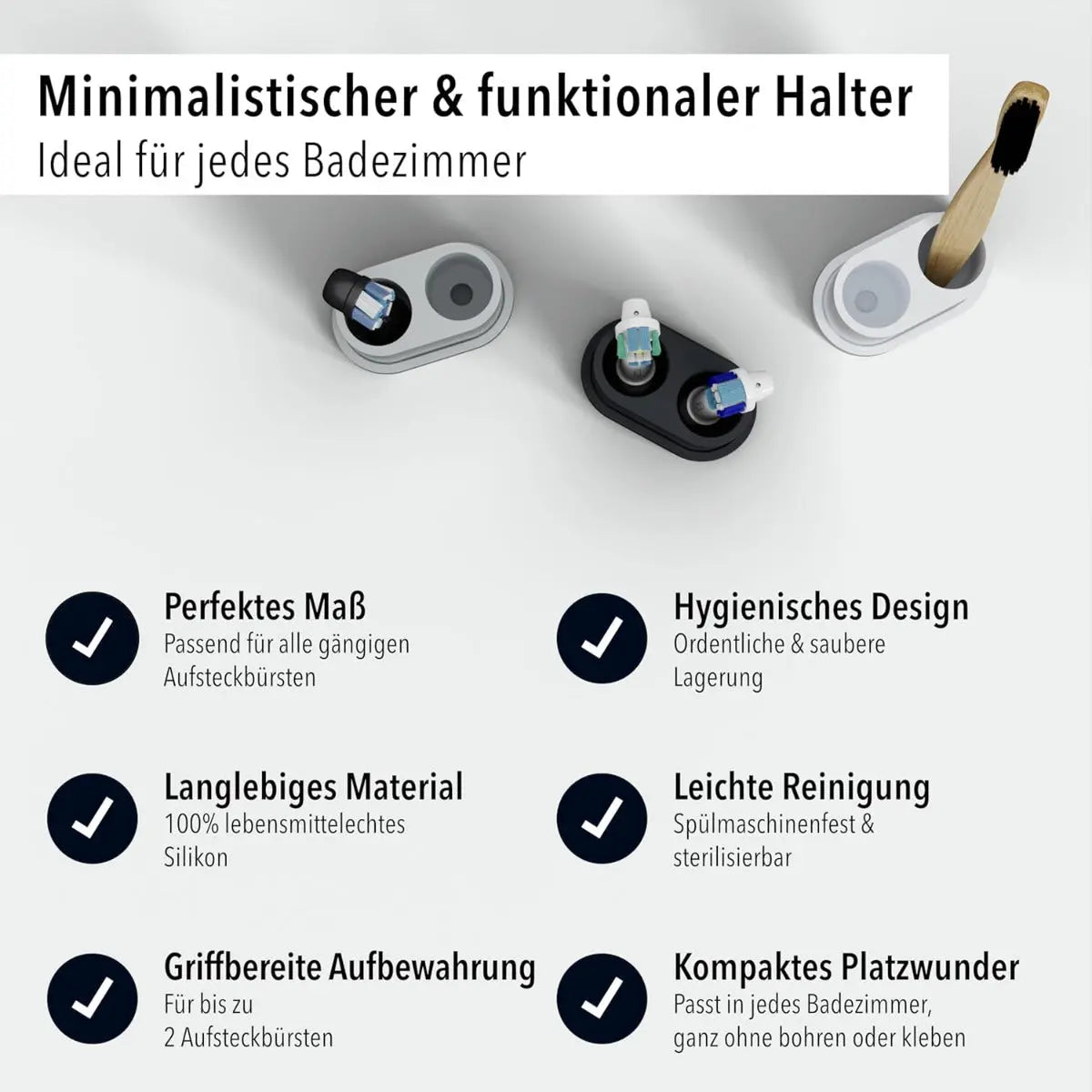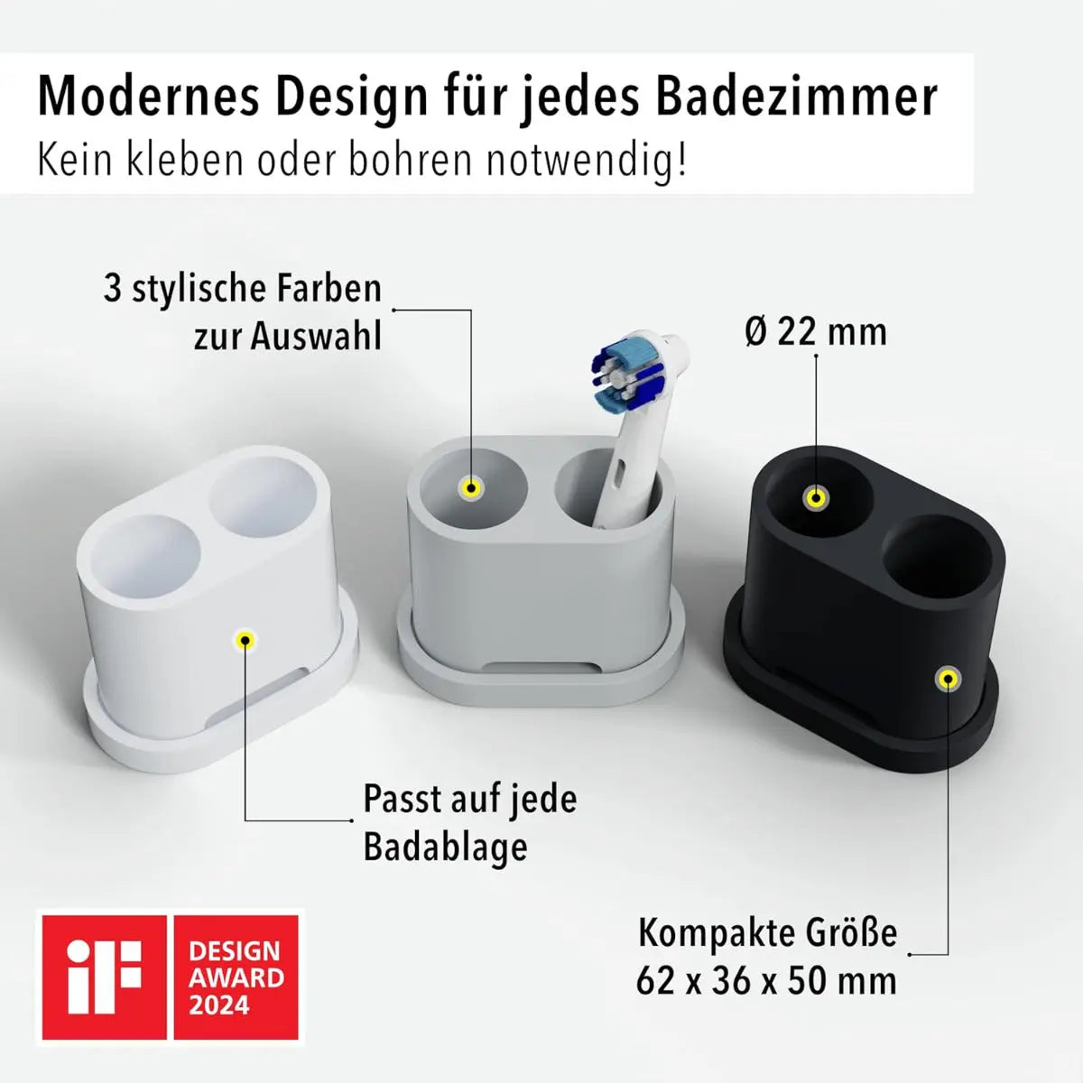 Der Halter ist universell kompatibel mit manuellen Zahnbürsten und gängigen elektrischen Aufsteckbürsten – darunter Modelle von Braun Oral-B, Oral-B iO und Philips Sonicare. Zwei Öffnungen mit je 22 mm Durchmesser bieten stabilen Halt, ohne die Bürstenköpfe zu verformen.