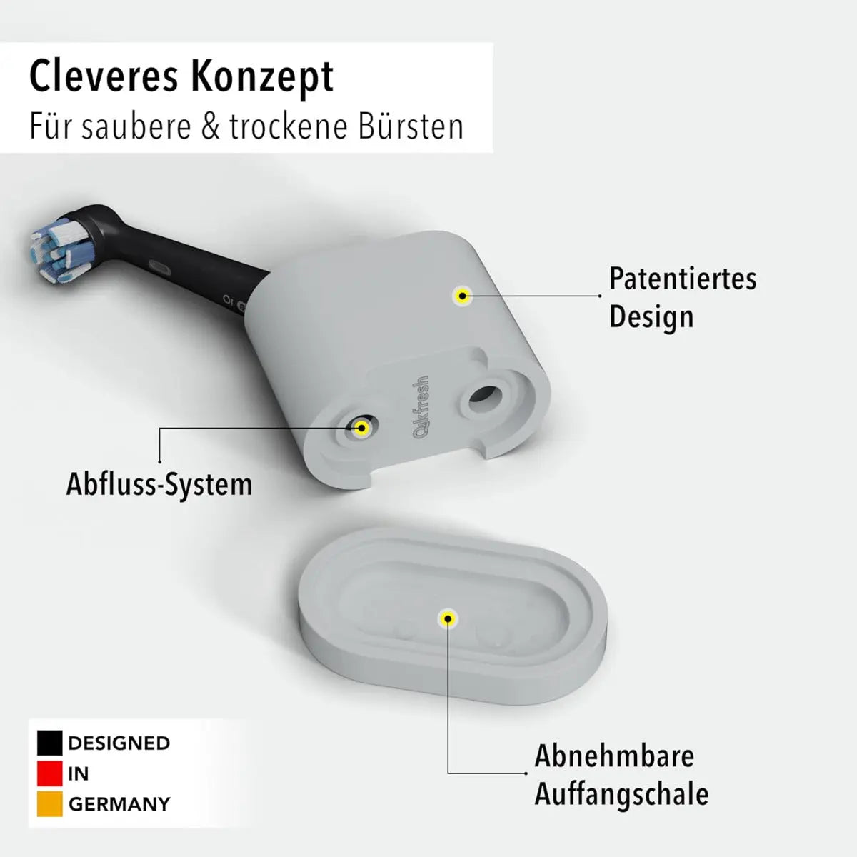 Dank des integrierten Abfluss- und Belüftungssystems bleiben Zahnbürsten und Aufsteckköpfe trocken und hygienisch sauber. Die abnehmbare Auffangschale mit umlaufender Schutzlippe fängt zuverlässig Tropfwasser auf und lässt sich schnell und unkompliziert reinigen.