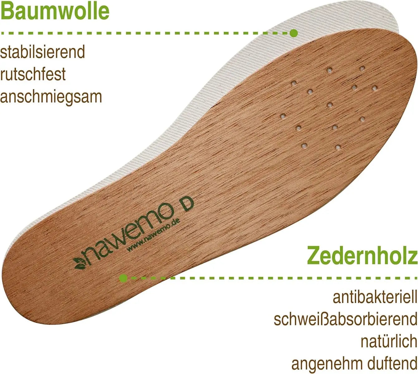 Die in Deutschland produzierten Zedernholzsohlen von Nawemo, hier in Grösse 45, bieten eine natürliche Lösung für Herrenfüsse gegen Schweiss und Fussgeruch. Gefertigt aus dünnem, flexiblem Zedernholz, passen sie sich hervorragend an verschiedene Schuhtypen an, ohne zu brechen. Die Sohlen sind speziell auf die Bedürfnisse von Herren zugeschnitten, die viel gehen oder stehen und unter kalten oder schwitzenden Füssen leiden. Durch ihre antibakteriellen und fungiziden Eigenschaften helfen sie, Fuss- und Nagelpilz zu verhindern. Sie sorgen für eine angenehme Temperaturregulierung und halten die Füsse angenehm trocken und frisch. Dank ihrer einfachen Pflege lassen sie sich leicht mit milden Reinigungsmitteln waschen.