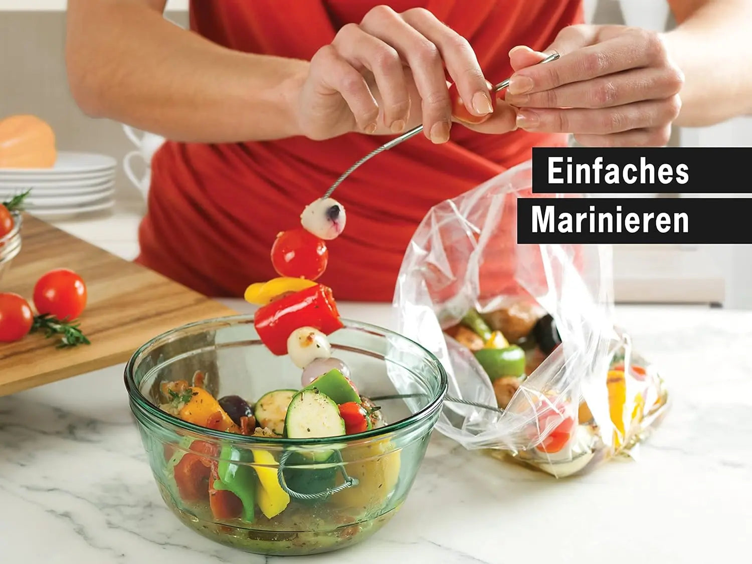 Endlich der Spiess, der durch seine Flexibilität auf jeden Grill passt. Auch das Marinieren ist einfacher als je zuvor. FireWire bestücken und ab in die Marinade. Durch seine Flexibilität kann FireWire problemlos in der Schüssel oder im Plastikbeutel mit mariniert werden.