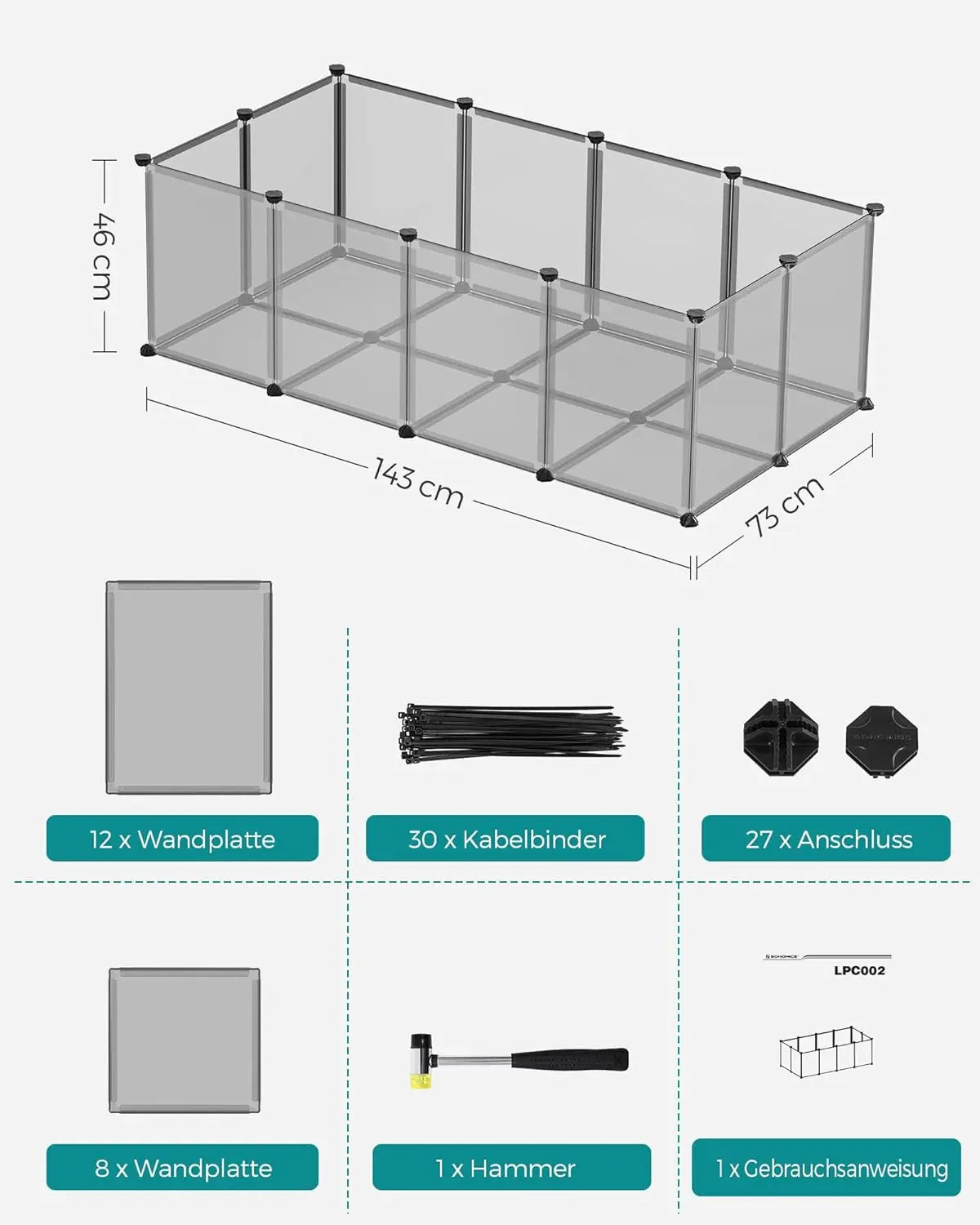 Die Montage ist kinderleicht: Verbinden Sie die robusten Kunststoffplatten einfach mit den Mehrfach-Winkelverbindern und dem mitgelieferten Gummihammer. In kürzester Zeit haben Sie ein sicheres Zuhause für Ihre pelzigen Freunde geschaffen!