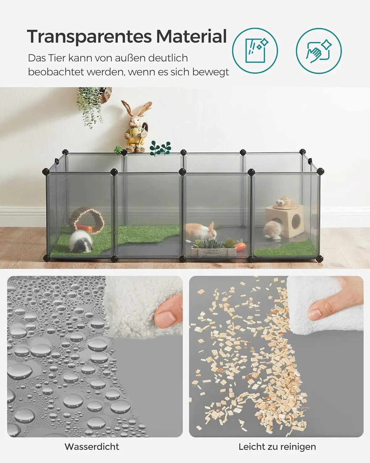 Dank der transparenten Kunststoffplatten haben Sie immer einen Blick auf Ihre Tiere und können mit ihnen spielen. Und wenn das Gehege mal schmutzig wird, ist die Reinigung ein Kinderspiel: Einfach mit einem feuchten Tuch abwischen und schon erstrahlt es wieder in neuem Glanz.