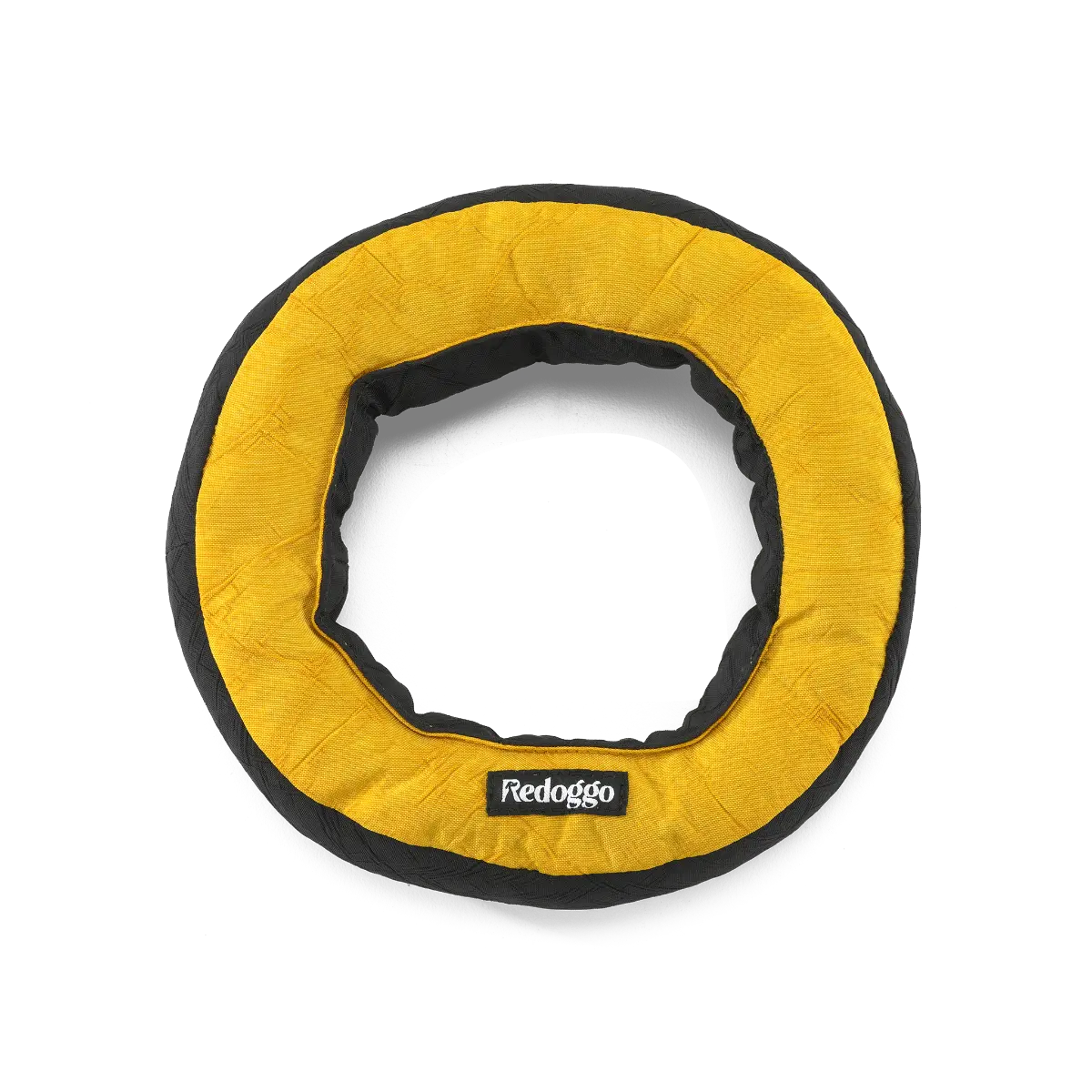 Der Redoggo Donut ist das perfekte Multifunktionsspielzeug für Hunde, die mehr als nur Bälle lieben. Seine besondere Donut-Form kombiniert Werfen, Apportieren und Ziehspiele in einem – für mehr Abwechslung im Hundealltag. Das dynamische Gelb-Schwarz-Design sieht nicht nur gut aus, sondern sorgt auch für optimale Sichtbarkeit im Gelände oder beim Spielen im Park oder in der Wohnung. Die weiche, aber robuste Oberfläche ist ideal für das Ziehen, Kauen und Herumtragen.