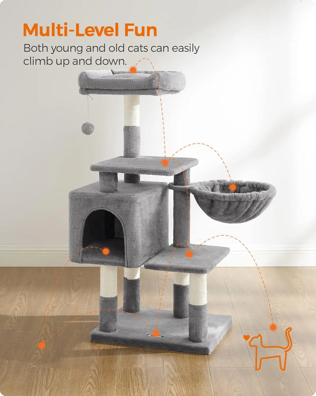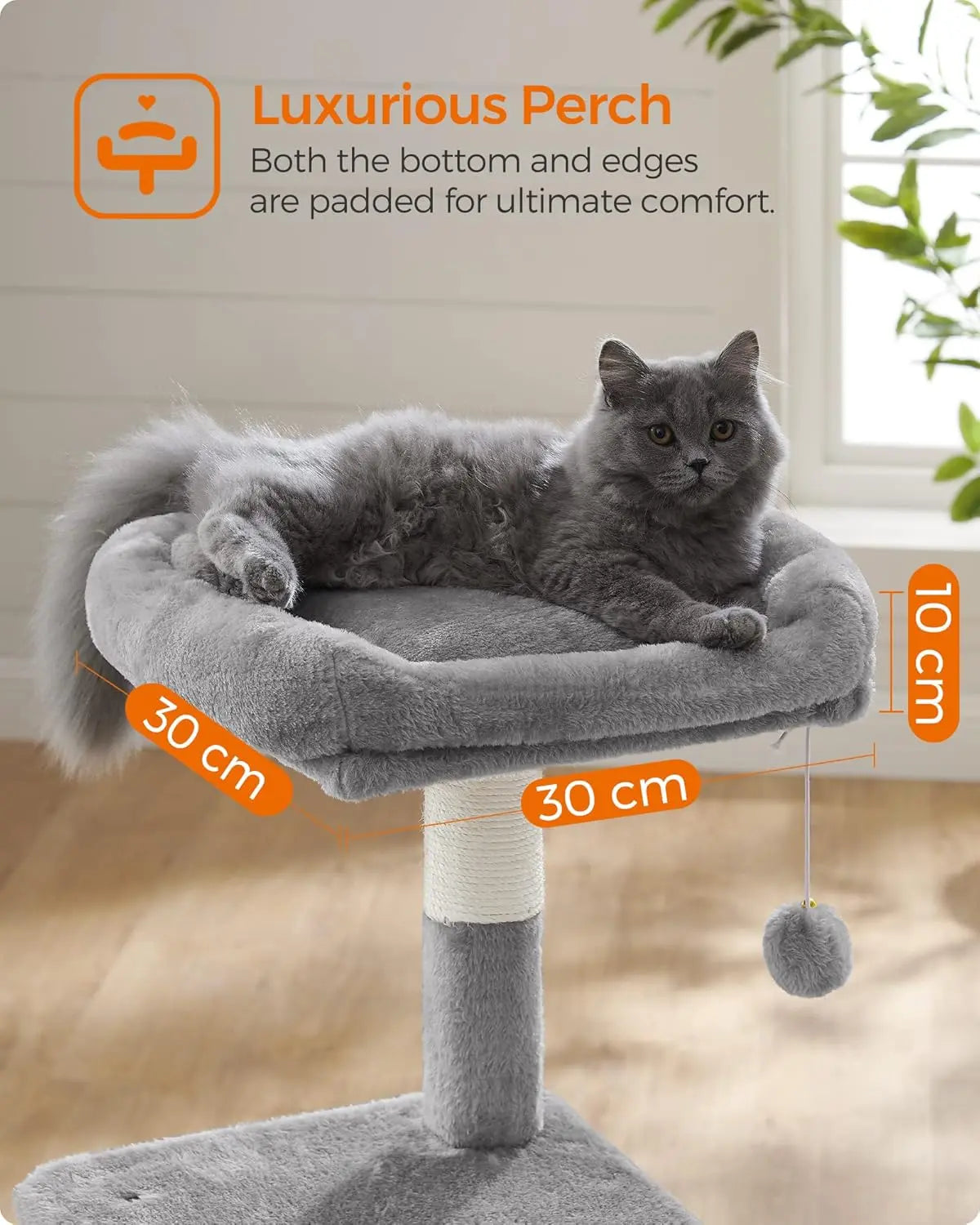 Entdecken Sie den Feandrea Kratzbaum – die perfekte Spiel- und Ruheoase für Ihre Katze! Mit einer Höhe von 110 cm bietet dieser hellgraue Katzenbaum sowohl für kleine Kätzchen als auch für erfahrene Katzensenioren die ideale Kletterlandschaft. Die durchdachte Anordnung der einzelnen Elemente ermöglicht es Ihren Samtpfoten, spielend leicht hinaufzuklettern und ihre Umgebung zu erkunden.