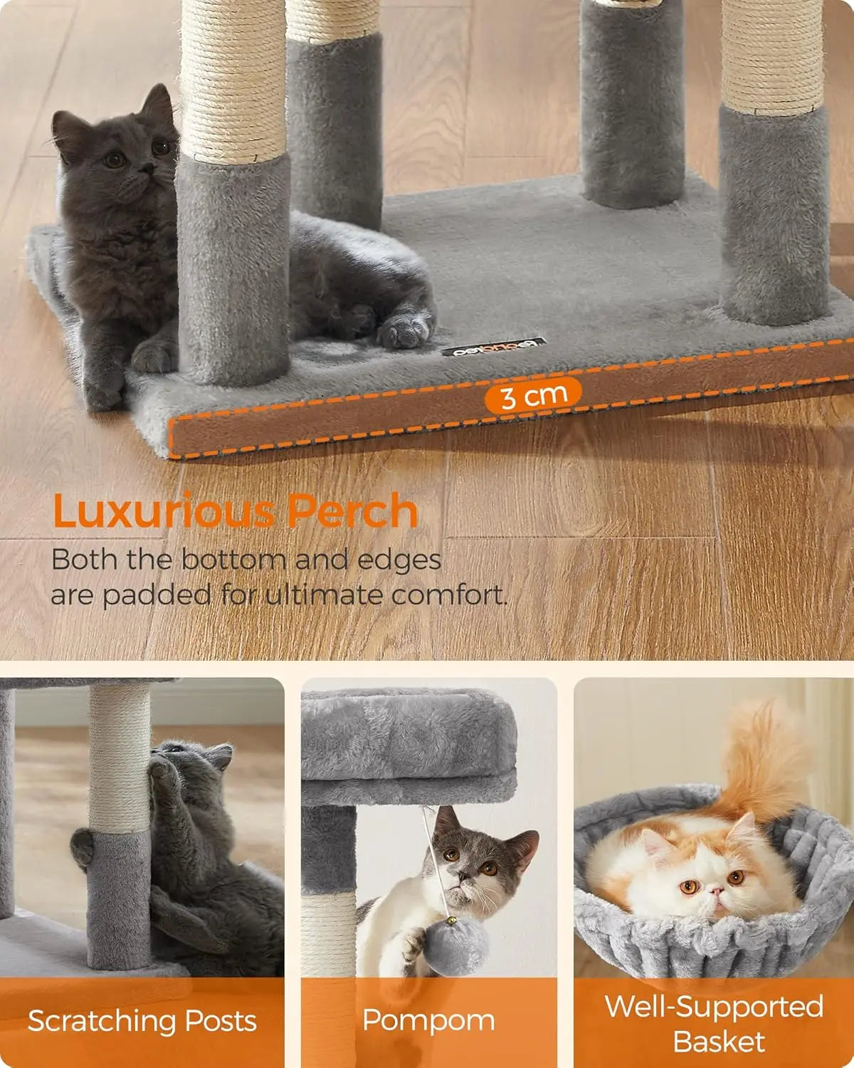 Kunden sind begeistert von der stabilen Bauweise und dem vielseitigen Design des 110 cm hohen Feandrea Kratzbaums. Besonders beliebt sind die gepolsterte Aussichtsplattform, die kuschelige Höhle und Liegemulde sowie die fünf mit Sisal umwickelten Stämme zum Krallenwetzen und Spielen. Die verstärkte Bodenplatte sorgt für sicheren Halt bei Sprüngen – ideal für Kätzchen und Senioren.