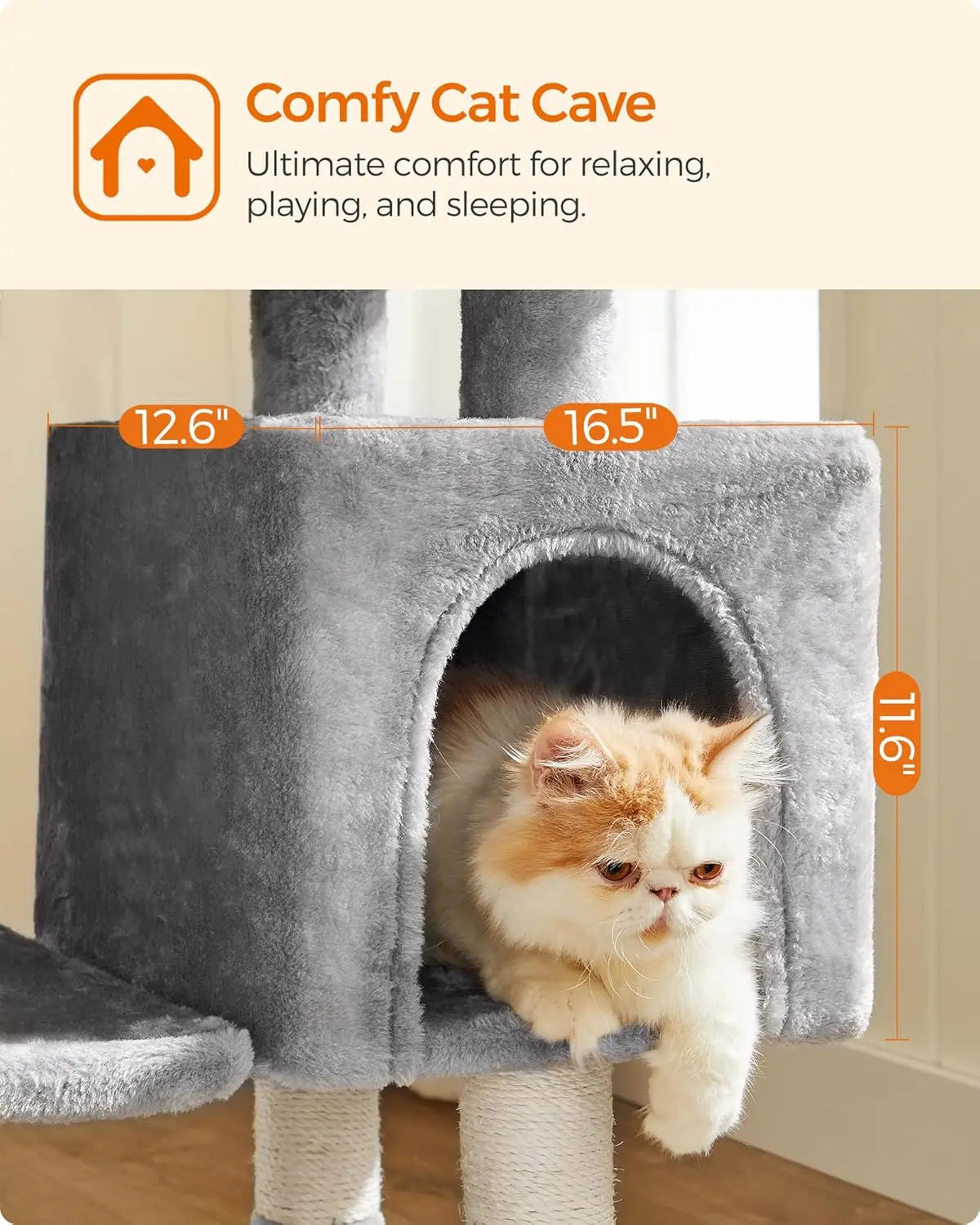 Dieser Kratzbaum ist nicht nur ein Spielplatz, sondern auch eine echte Traumimmobilie für Ihre Katze. Die gepolsterte Aussichtsplattform fungiert als geräumiger Balkon, während der untere Bereich als Spielplatz dient. Hier finden Ihre Katzen ein gemütliches Schlafzimmer in Form einer kuscheligen Liegemulde sowie eine einladende Kuschelhöhle – der perfekte Rückzugsort für entspannte Nickerchen.